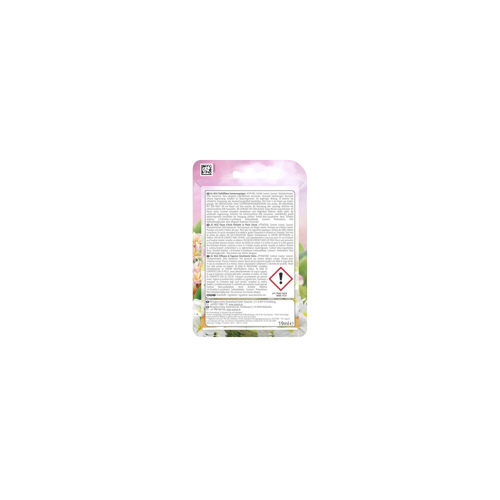 Air Wick Duftölflakon Starter-Set Sommervergnügen - Frische weiße Blüten, fruchtige Melone und süße Vanille bringen die Erinnerung an einen sonnigen Tag zu Ihnen nach Hause. Das neue Duftölflakon-Gerät mit dem niedrigsten Stromverbrauch von Air Wick ermöglicht eine ideale Duftverteilung in jede Ecke des Raumes. In Verwendung mit den hochwertigen Air Wick Duftölflakons mit ätherischen Ölen neutralisiert es Gerüche und verbreitet einen angenehmen Duft in Ihrem Zuhause. Die neue Formel enthält zudem naturbasierte Inhaltsstoffe und ist frei von Aceton, Farbstoffen und Phthalaten. Das Duftölflakon-Gerät für die Steckdose ist in 5 Stufen regulierbar und bietet so ein komfortables, kontinuierliches Dufterlebnis für bis zu 120 Tage pro Nachfüller. Vor Gebrauch stets Kennzeichnung und Produktinformation lesen. www.rbeuroinfo.com.