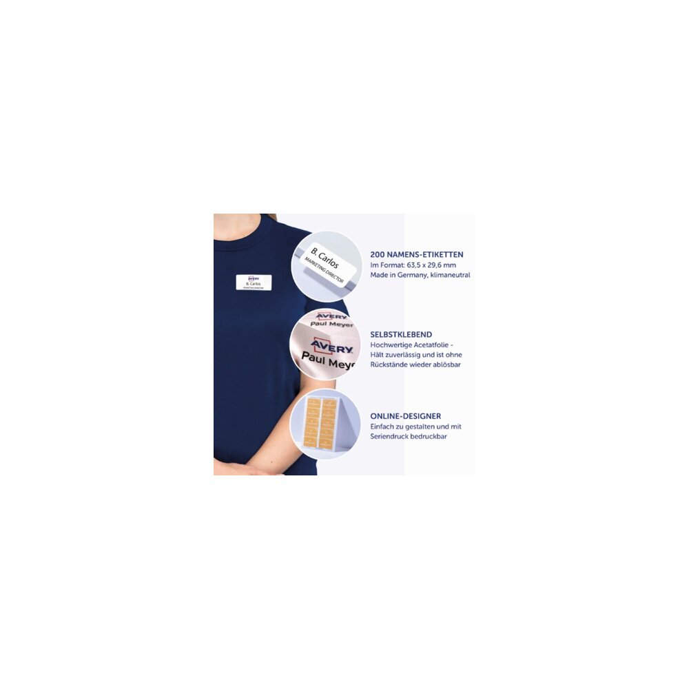 Qualität vom Etiketten-Experten: die selbstklebenden, ablösbaren Namens-Etiketten erleichtern Ihnen die Organisation von Veranstaltungen, Seminaren und Konferenzen und sind die perfekte Alternative zu Plastikschildern mit Nadel oder Clip. Die Textil-Etiketten aus Acetatseide haften zuverlässig auf Kleidung und Textilien und lassen sich rückstandsfrei wieder ablösen (nicht geeignet für Leder, Seide, Samt und andere empfindliche Textilien). Die Rückseiten-Stanzung der Namensschilder erlaubt das einfache Heraustrennen der Namens-Etiketten samt Trägerfolie für eine spätere Verwendung. So arbeiten Sie effizient wie stressfrei und schaffen sich wertvolle Zeit für die wirklich wichtigen Dinge und mit dem kostenlosen Online Etiketten-Designer unter www.avery.eu/print können Sie Ihr Etikett einfach & individuell selbst gestalten.