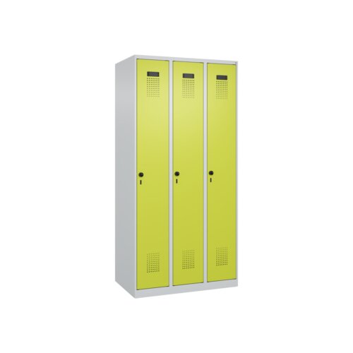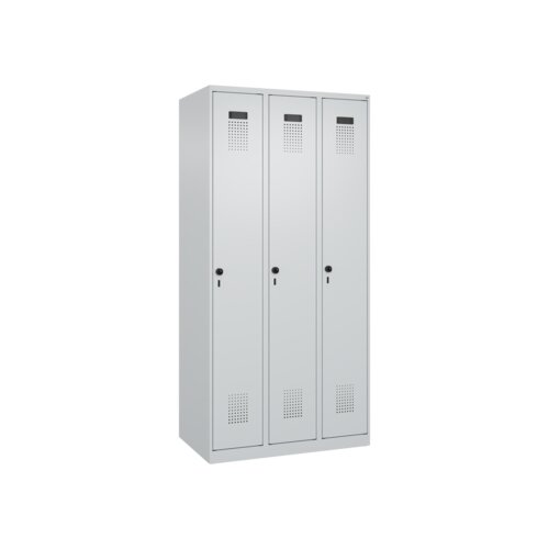 Garderobenschrank Evolo PLUS mit hochwertiger Einbrennbeschichtung für hohe UV- und Korrosionsbeständigkeit. Geschlossene und abgeschrägte Seitenprofile für leichte Innenreinigung und komfortable Entnahme von Kleidung. Türen mit Soft-Anschlag und geschlossenen Seitenprofilen für höchste Stabilität, mit reinigungsfreundlichem Belüftungslochbild oben und unten. Aufhängung in stabilen Drehbolzen. 2 ergonomische Sicherheits-Drehriegel für Vorhangschlösser mit Bügelstärke 6 bis 8 mm. Inkl. Tür-Schutz. Mit schwarzen, selbstklebenden Kunststoff-Etikettenrahmen, inkl. Klarsichtkunststoff-Abdeckung und weißem Etikett zur individuellen Beschriftung. Achtung: Anlieferungsmöglichkeit durch Sattelschlepper muss gegeben sein.