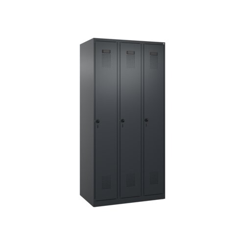 Garderobenschrank Evolo PLUS mit hochwertiger Einbrennbeschichtung für hohe UV- und Korrosionsbeständigkeit. Geschlossene und abgeschrägte Seitenprofile für leichte Innenreinigung und komfortable Entnahme von Kleidung. Türen mit Soft-Anschlag und geschlossenen Seitenprofilen für höchste Stabilität, mit reinigungsfreundlichem Belüftungslochbild oben und unten. Aufhängung in stabilen Drehbolzen. 2 ergonomische Sicherheits-Drehriegel für Vorhangschlösser mit Bügelstärke 6 bis 8 mm. Inkl. Tür-Schutz. Mit schwarzen, selbstklebenden Kunststoff-Etikettenrahmen, inkl. Klarsichtkunststoff-Abdeckung und weißem Etikett zur individuellen Beschriftung. Achtung: Anlieferungsmöglichkeit durch Sattelschlepper muss gegeben sein.