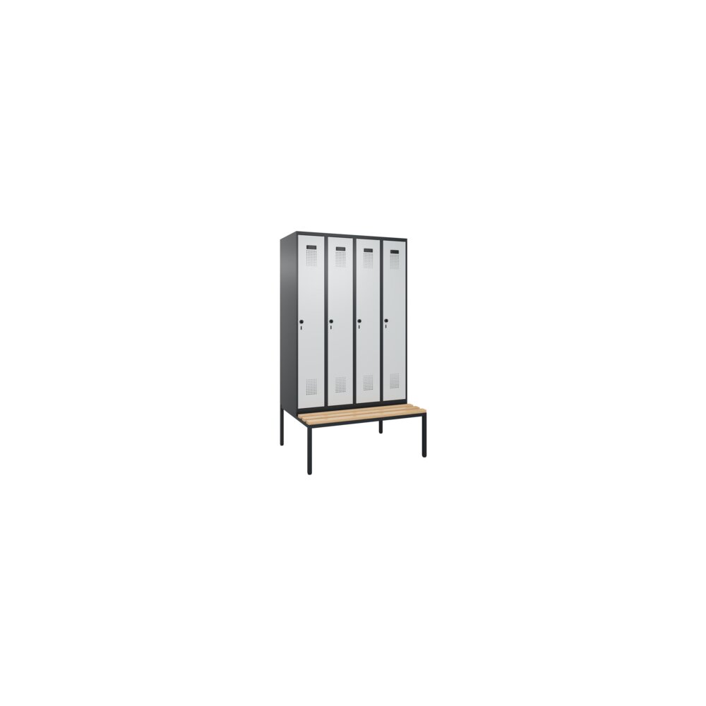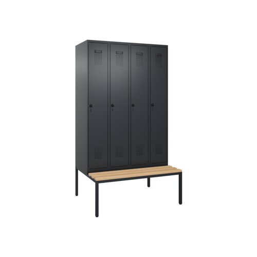 Spind Evolo PLUS mit hochwertiger Einbrennbeschichtung für hohe UV- und Korrosionsbeständigkeit. Geschlossene und abgeschrägte Seitenprofile für leichte Innenreinigung und komfortable Entnahme von Kleidung und Taschen. Geeignet für verdeckte Kabelführung. Mit hinteren Belüftungsöffnungen oben und unten. Innen 1 Ablageboden, darunter 1 stabile Garderobenstange aus Ovalprofil mit 3 verdrehsicheren Doppel-Schiebehaken. Inkl. Systemaufnahme. Sitzbank mit verstellbaren Bodengleitern für einfachen Niveauausgleich. Mit Türöffnungsbegrenzer, als Schutz vor Überdehnen der Tür. Türen rechts angeschlagen. Türen mit Soft-Anschlag und geschlossenen Seitenprofilen für höchste Stabilität. Aufhängung in stabilen Drehbolzen. 4 ergonomische Sicherheits-Drehriegel für Vorhangschlösser mit Bügelstärke 6 bis 8 mm. Mit Kunststoff-Etikettenrahmen, schwarz, selbstklebend, inkl. Klarsichtkunststoff-Abdeckung und weißem Etikett zur individuellen Beschriftung. Achtung: Anlieferungsmöglichkeit durch Sattelschlepper muss gegeben sein.