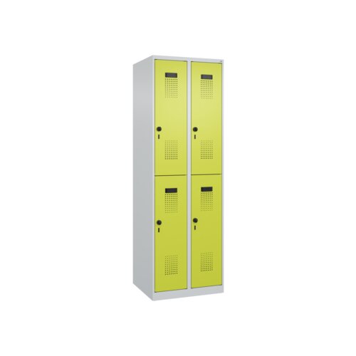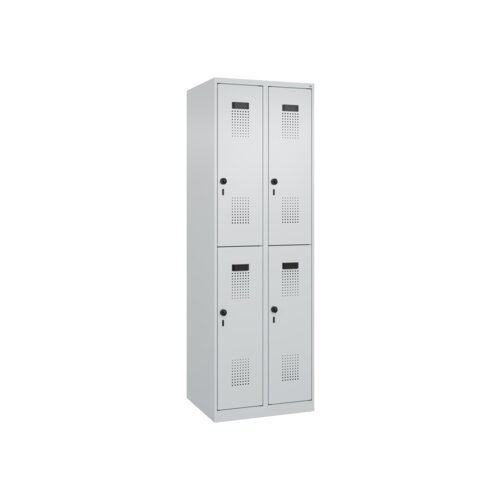 Doppelstöckiger Spind Evolo PLUS mit hochwertiger Einbrennbeschichtung für hohe UV- und Korrosionsbeständigkeit. Geschlossene und abgeschrägte Seitenprofile für leichte Innenreinigung und komfortable Entnahme von Kleidung und Taschen. Geeignet für verdeckte Kabelführung. Mit hinteren Belüftungsöffnungen oben und unten. Innen je Fach 1 stabile Garderobenstange aus Ovalprofil mit 3 verdrehsicheren Doppel-Schiebehaken inkl. Systemaufnahme. Türöffnungsbegrenzer als Schutz vor Überdehnen der Tür. Türen rechts angeschlagen, mit Soft-Anschlag und geschlossenen Seitenprofilen für höchste Stabilität. Aufhängung in stabilen Drehbolzen. Ergonomische Sicherheits-Drehriegel für Vorhangschlösser mit Bügelstärke 6 bis 8 mm. Inkl. Tür-Schutz. Kunststoff-Etikettenrahmen, schwarz, selbstklebend, inkl. Klarsichtkunststoff-Abdeckung und weißem Etikett zur individuellen Beschriftung. Achtung: Anlieferungsmöglichkeit durch Sattelschlepper muss gegeben sein.