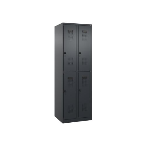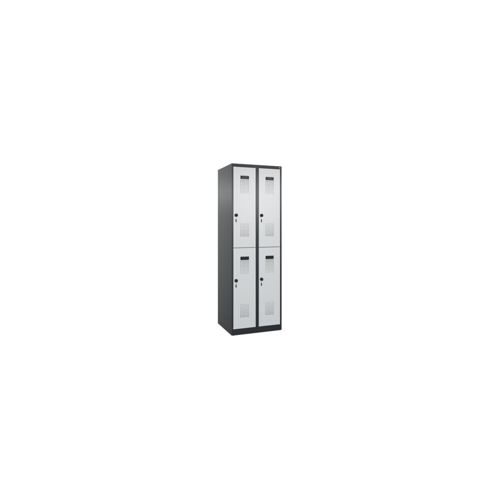 Doppelstöckiger Spind Evolo PLUS mit hochwertiger Einbrennbeschichtung für hohe UV- und Korrosionsbeständigkeit. Geschlossene und abgeschrägte Seitenprofile für leichte Innenreinigung und komfortable Entnahme von Kleidung und Taschen. Geeignet für verdeckte Kabelführung. Mit hinteren Belüftungsöffnungen oben und unten. Innen je Fach 1 stabile Garderobenstange aus Ovalprofil mit 3 verdrehsicheren Doppel-Schiebehaken inkl. Systemaufnahme. Türöffnungsbegrenzer als Schutz vor Überdehnen der Tür. Türen rechts angeschlagen, mit Soft-Anschlag und geschlossenen Seitenprofilen für höchste Stabilität. Aufhängung in stabilen Drehbolzen. Ergonomische Sicherheits-Drehriegel für Vorhangschlösser mit Bügelstärke 6 bis 8 mm. Inkl. Tür-Schutz. Kunststoff-Etikettenrahmen, schwarz, selbstklebend, inkl. Klarsichtkunststoff-Abdeckung und weißem Etikett zur individuellen Beschriftung. Achtung: Anlieferungsmöglichkeit durch Sattelschlepper muss gegeben sein.
