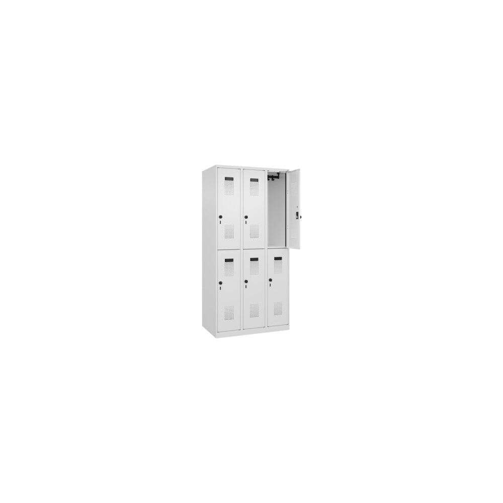 Doppelstöckiger Spind Evolo PLUS mit hochwertiger Einbrennbeschichtung für hohe UV- und Korrosionsbeständigkeit. Geschlossene und abgeschrägte Seitenprofile für leichte Innenreinigung und komfortable Entnahme von Kleidung und Taschen. Geeignet für verdeckte Kabelführung. Mit hinteren Belüftungsöffnungen oben und unten. Innen je Fach 1 stabile Garderobenstange aus Ovalprofil mit 3 verdrehsicheren Doppel-Schiebehaken inkl. Systemaufnahme. Türöffnungsbegrenzer als Schutz vor Überdehnen der Tür. Türen rechts angeschlagen, mit Soft-Anschlag und geschlossenen Seitenprofilen für höchste Stabilität. Aufhängung in stabilen Drehbolzen. Ergonomische Sicherheits-Drehriegel für Vorhangschlösser mit Bügelstärke 6 bis 8 mm. Inkl. Tür-Schutz. Kunststoff-Etikettenrahmen, schwarz, selbstklebend, inkl. Klarsichtkunststoff-Abdeckung und weißem Etikett zur individuellen Beschriftung. Achtung: Anlieferungsmöglichkeit durch Sattelschlepper muss gegeben sein.