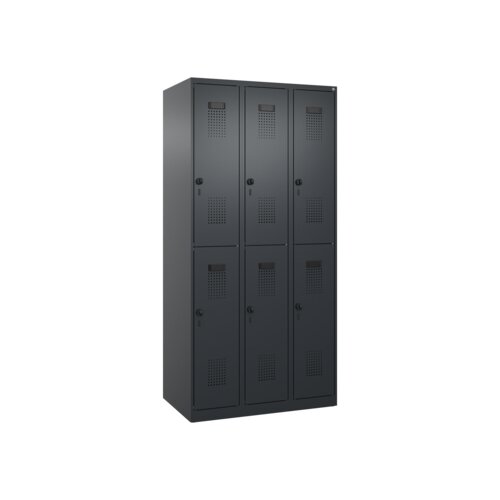 Doppelstöckiger Spind Evolo PLUS mit hochwertiger Einbrennbeschichtung für hohe UV- und Korrosionsbeständigkeit. Geschlossene und abgeschrägte Seitenprofile für leichte Innenreinigung und komfortable Entnahme von Kleidung und Taschen. Geeignet für verdeckte Kabelführung. Mit hinteren Belüftungsöffnungen oben und unten. Innen je Fach 1 stabile Garderobenstange aus Ovalprofil mit 3 verdrehsicheren Doppel-Schiebehaken inkl. Systemaufnahme. Türöffnungsbegrenzer als Schutz vor Überdehnen der Tür. Türen rechts angeschlagen, mit Soft-Anschlag und geschlossenen Seitenprofilen für höchste Stabilität. Aufhängung in stabilen Drehbolzen. Ergonomische Sicherheits-Drehriegel für Vorhangschlösser mit Bügelstärke 6 bis 8 mm. Inkl. Tür-Schutz. Kunststoff-Etikettenrahmen, schwarz, selbstklebend, inkl. Klarsichtkunststoff-Abdeckung und weißem Etikett zur individuellen Beschriftung. Achtung: Anlieferungsmöglichkeit durch Sattelschlepper muss gegeben sein.