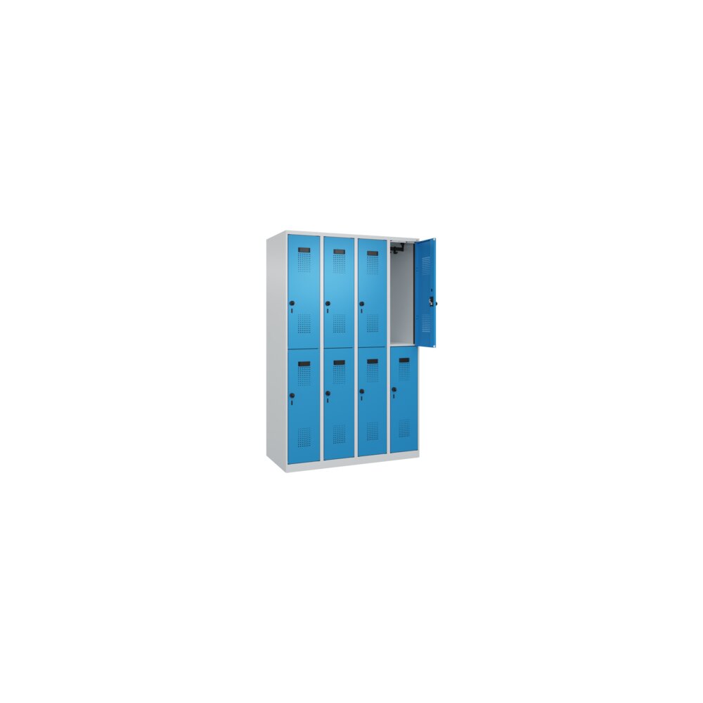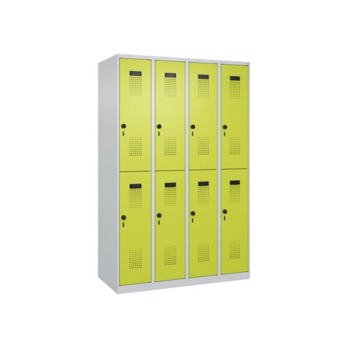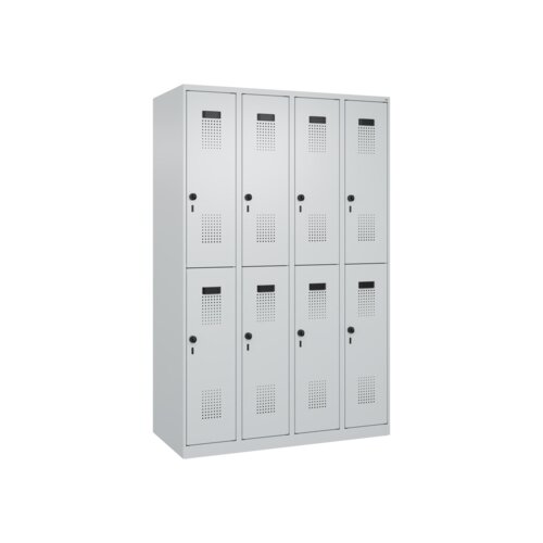 Doppelstöckiger Spind Evolo PLUS mit hochwertiger Einbrennbeschichtung für hohe UV- und Korrosionsbeständigkeit. Geschlossene und abgeschrägte Seitenprofile für leichte Innenreinigung und komfortable Entnahme von Kleidung und Taschen. Geeignet für verdeckte Kabelführung. Mit hinteren Belüftungsöffnungen oben und unten. Innen je Fach 1 stabile Garderobenstange aus Ovalprofil mit 3 verdrehsicheren Doppel-Schiebehaken inkl. Systemaufnahme. Türöffnungsbegrenzer als Schutz vor Überdehnen der Tür. Türen rechts angeschlagen, mit Soft-Anschlag und geschlossenen Seitenprofilen für höchste Stabilität. Aufhängung in stabilen Drehbolzen. Ergonomische Sicherheits-Drehriegel für Vorhangschlösser mit Bügelstärke 6 bis 8 mm. Inkl. Tür-Schutz. Kunststoff-Etikettenrahmen, schwarz, selbstklebend, inkl. Klarsichtkunststoff-Abdeckung und weißem Etikett zur individuellen Beschriftung. Achtung: Anlieferungsmöglichkeit durch Sattelschlepper muss gegeben sein.
