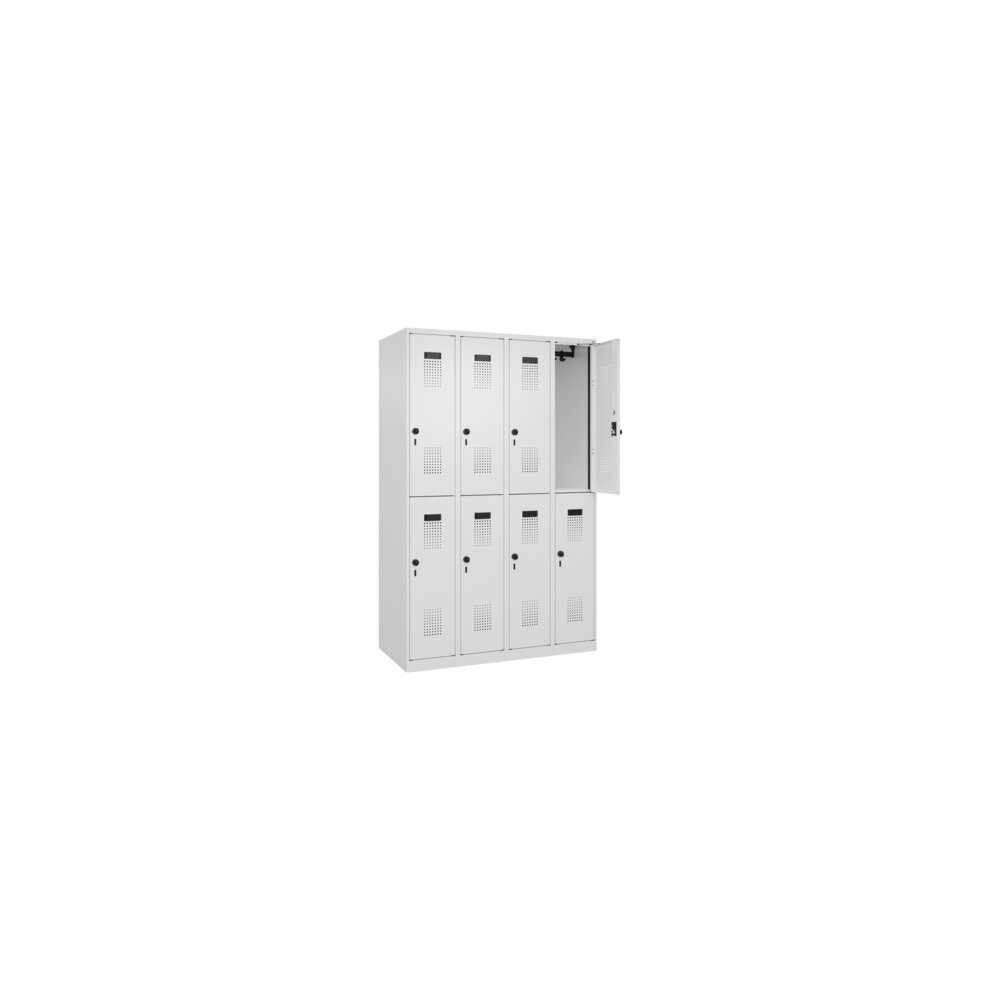 Doppelstöckiger Spind Evolo PLUS mit hochwertiger Einbrennbeschichtung für hohe UV- und Korrosionsbeständigkeit. Geschlossene und abgeschrägte Seitenprofile für leichte Innenreinigung und komfortable Entnahme von Kleidung und Taschen. Geeignet für verdeckte Kabelführung. Mit hinteren Belüftungsöffnungen oben und unten. Innen je Fach 1 stabile Garderobenstange aus Ovalprofil mit 3 verdrehsicheren Doppel-Schiebehaken inkl. Systemaufnahme. Türöffnungsbegrenzer als Schutz vor Überdehnen der Tür. Türen rechts angeschlagen, mit Soft-Anschlag und geschlossenen Seitenprofilen für höchste Stabilität. Aufhängung in stabilen Drehbolzen. Ergonomische Sicherheits-Drehriegel für Vorhangschlösser mit Bügelstärke 6 bis 8 mm. Inkl. Tür-Schutz. Kunststoff-Etikettenrahmen, schwarz, selbstklebend, inkl. Klarsichtkunststoff-Abdeckung und weißem Etikett zur individuellen Beschriftung. Achtung: Anlieferungsmöglichkeit durch Sattelschlepper muss gegeben sein.