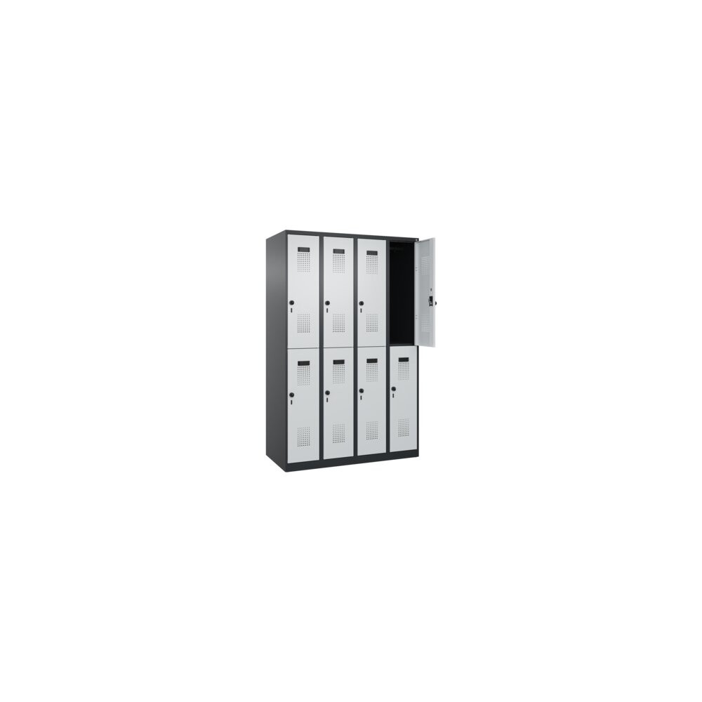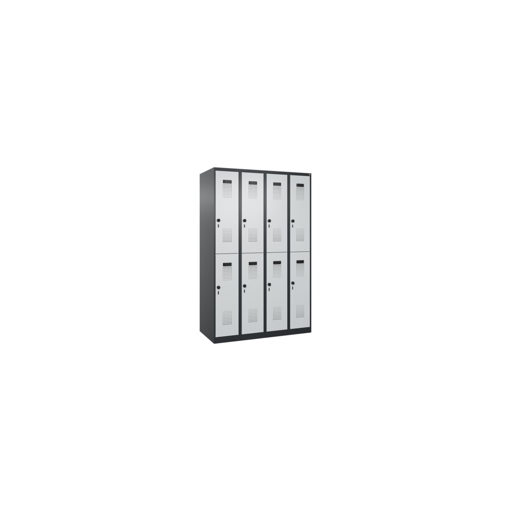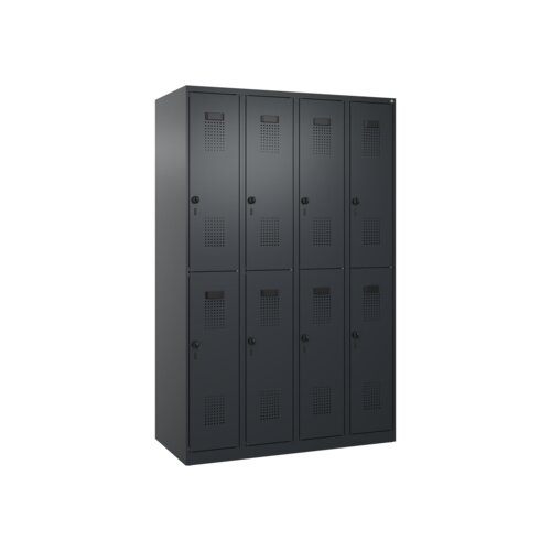 Doppelstöckiger Spind Evolo PLUS mit hochwertiger Einbrennbeschichtung für hohe UV- und Korrosionsbeständigkeit. Geschlossene und abgeschrägte Seitenprofile für leichte Innenreinigung und komfortable Entnahme von Kleidung und Taschen. Geeignet für verdeckte Kabelführung. Mit hinteren Belüftungsöffnungen oben und unten. Innen je Fach 1 stabile Garderobenstange aus Ovalprofil mit 3 verdrehsicheren Doppel-Schiebehaken inkl. Systemaufnahme. Türöffnungsbegrenzer als Schutz vor Überdehnen der Tür. Türen rechts angeschlagen, mit Soft-Anschlag und geschlossenen Seitenprofilen für höchste Stabilität. Aufhängung in stabilen Drehbolzen. Ergonomische Sicherheits-Drehriegel für Vorhangschlösser mit Bügelstärke 6 bis 8 mm. Inkl. Tür-Schutz. Kunststoff-Etikettenrahmen, schwarz, selbstklebend, inkl. Klarsichtkunststoff-Abdeckung und weißem Etikett zur individuellen Beschriftung. Achtung: Anlieferungsmöglichkeit durch Sattelschlepper muss gegeben sein.