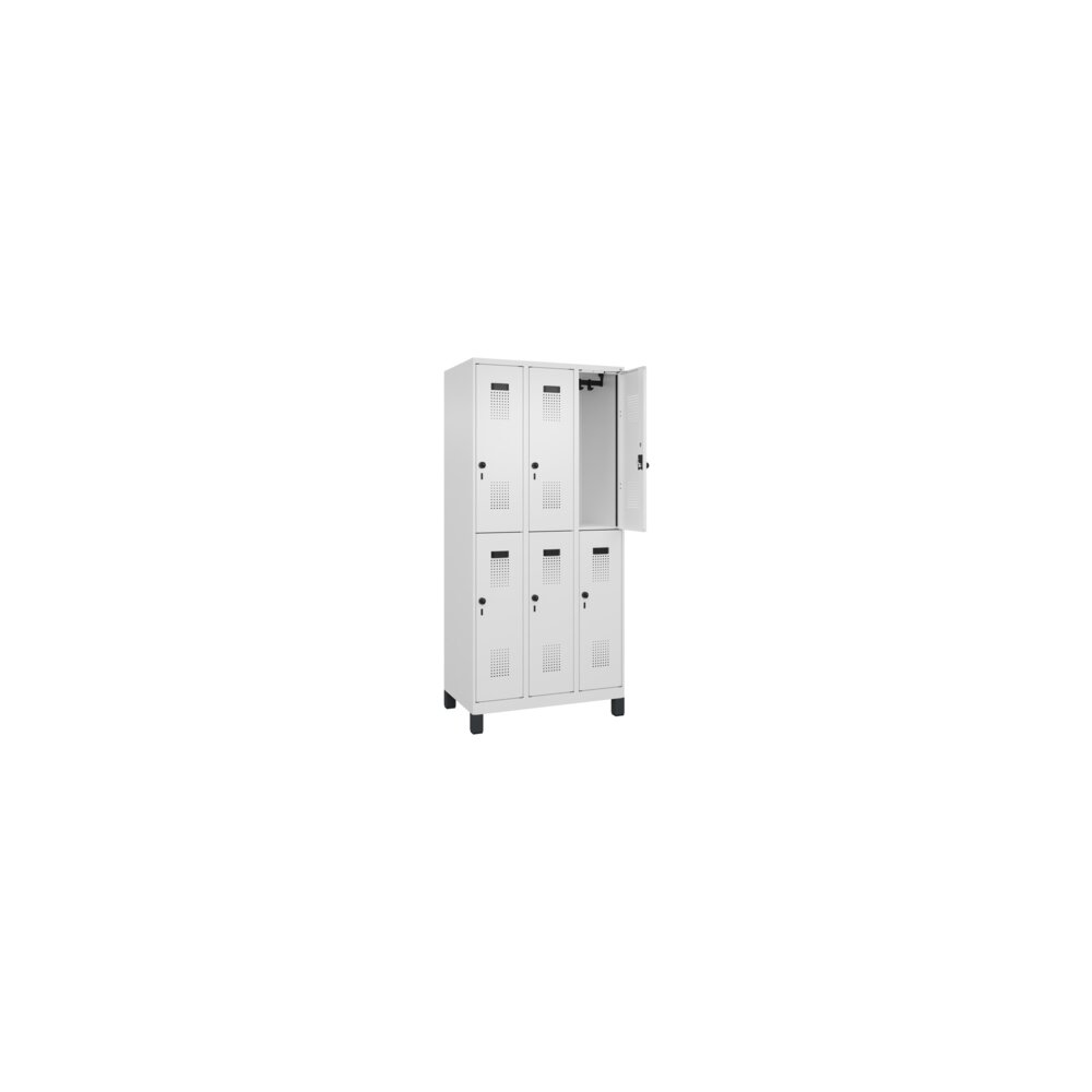 Doppelstöckiger Spind Evolo PLUS mit hochwertiger Einbrennbeschichtung für hohe UV- und Korrosionsbeständigkeit. Geschlossene und abgeschrägte Seitenprofile für leichte Innenreinigung und komfortable Entnahme von Kleidung und Taschen. Geeignet für verdeckte Kabelführung. Mit hinteren Belüftungsöffnungen oben und unten. Innen je Fach 1 stabile Garderobenstange aus Ovalprofil mit 3 verdrehsicheren Doppel-Schiebehaken inkl. Systemaufnahme. Türöffnungsbegrenzer als Schutz vor Überdehnen der Tür. Türen rechts angeschlagen, mit Soft-Anschlag und geschlossenen Seitenprofilen für höchste Stabilität. Aufhängung in stabilen Drehbolzen. Ergonomische Sicherheits-Drehriegel für Vorhangschlösser mit Bügelstärke 6 bis 8 mm. Inkl. Tür-Schutz. Kunststoff-Etikettenrahmen, schwarz, selbstklebend, inkl. Klarsichtkunststoff-Abdeckung und weißem Etikett zur individuellen Beschriftung. Achtung: Anlieferungsmöglichkeit durch Sattelschlepper muss gegeben sein.