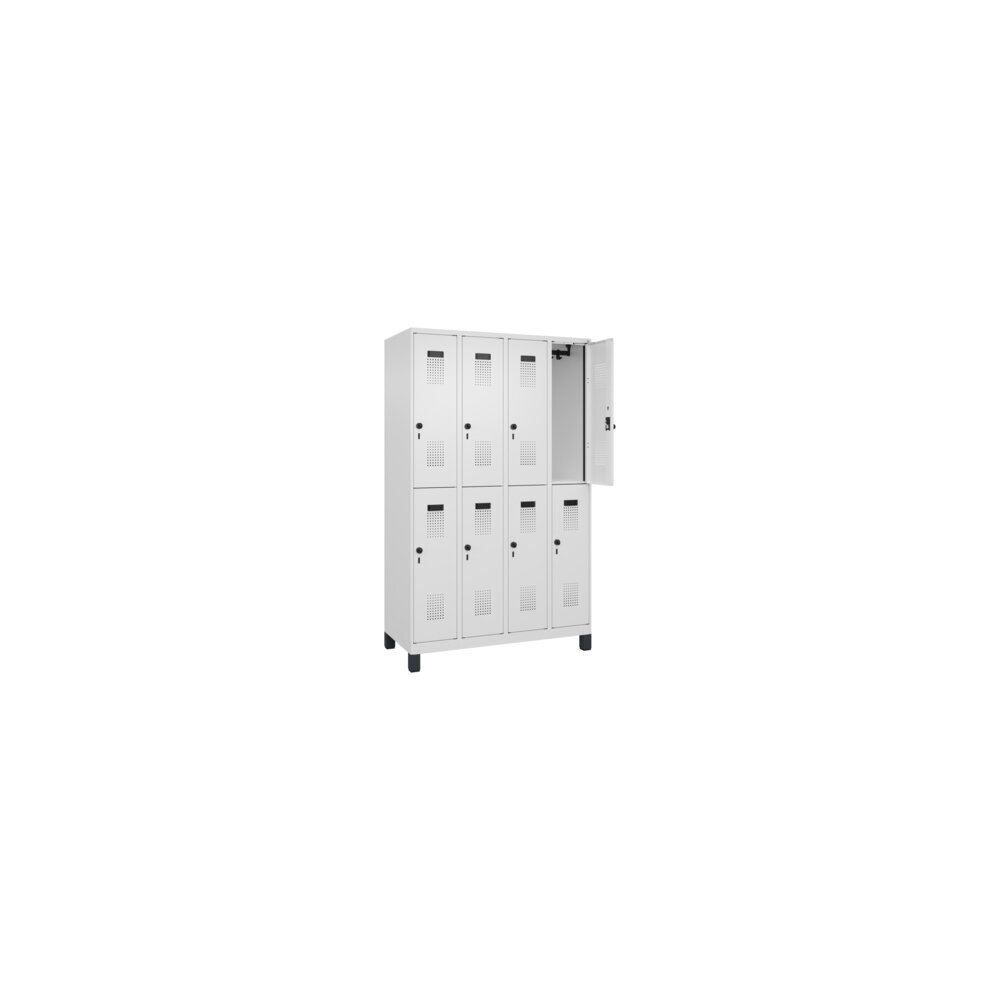Doppelstöckiger Spind Evolo PLUS mit hochwertiger Einbrennbeschichtung für hohe UV- und Korrosionsbeständigkeit. Geschlossene und abgeschrägte Seitenprofile für leichte Innenreinigung und komfortable Entnahme von Kleidung und Taschen. Geeignet für verdeckte Kabelführung. Mit hinteren Belüftungsöffnungen oben und unten. Innen je Fach 1 stabile Garderobenstange aus Ovalprofil mit 3 verdrehsicheren Doppel-Schiebehaken inkl. Systemaufnahme. Türöffnungsbegrenzer als Schutz vor Überdehnen der Tür. Türen rechts angeschlagen, mit Soft-Anschlag und geschlossenen Seitenprofilen für höchste Stabilität. Aufhängung in stabilen Drehbolzen. Ergonomische Sicherheits-Drehriegel für Vorhangschlösser mit Bügelstärke 6 bis 8 mm. Inkl. Tür-Schutz. Kunststoff-Etikettenrahmen, schwarz, selbstklebend, inkl. Klarsichtkunststoff-Abdeckung und weißem Etikett zur individuellen Beschriftung. Achtung: Anlieferungsmöglichkeit durch Sattelschlepper muss gegeben sein.