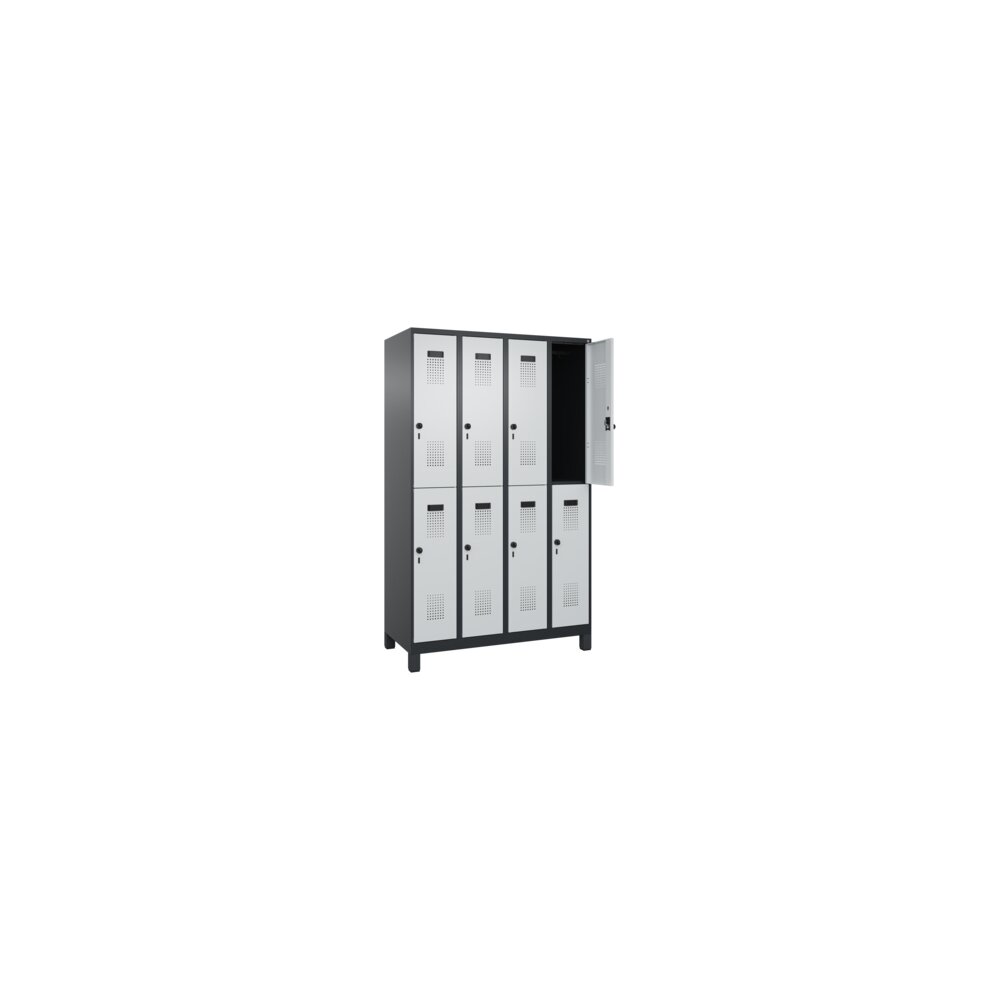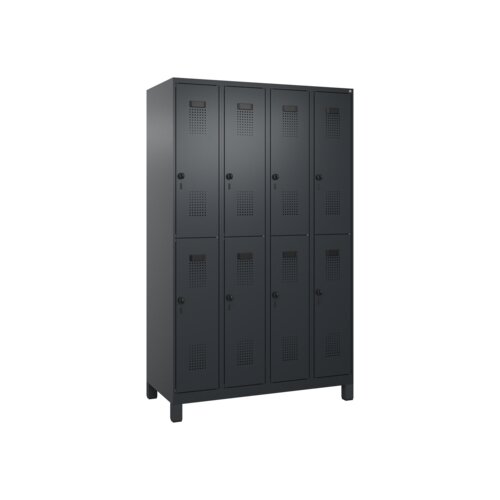 Doppelstöckiger Spind Evolo PLUS mit hochwertiger Einbrennbeschichtung für hohe UV- und Korrosionsbeständigkeit. Geschlossene und abgeschrägte Seitenprofile für leichte Innenreinigung und komfortable Entnahme von Kleidung und Taschen. Geeignet für verdeckte Kabelführung. Mit hinteren Belüftungsöffnungen oben und unten. Innen je Fach 1 stabile Garderobenstange aus Ovalprofil mit 3 verdrehsicheren Doppel-Schiebehaken inkl. Systemaufnahme. Türöffnungsbegrenzer als Schutz vor Überdehnen der Tür. Türen rechts angeschlagen, mit Soft-Anschlag und geschlossenen Seitenprofilen für höchste Stabilität. Aufhängung in stabilen Drehbolzen. Ergonomische Sicherheits-Drehriegel für Vorhangschlösser mit Bügelstärke 6 bis 8 mm. Inkl. Tür-Schutz. Kunststoff-Etikettenrahmen, schwarz, selbstklebend, inkl. Klarsichtkunststoff-Abdeckung und weißem Etikett zur individuellen Beschriftung. Achtung: Anlieferungsmöglichkeit durch Sattelschlepper muss gegeben sein.
