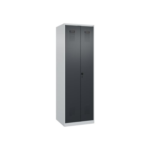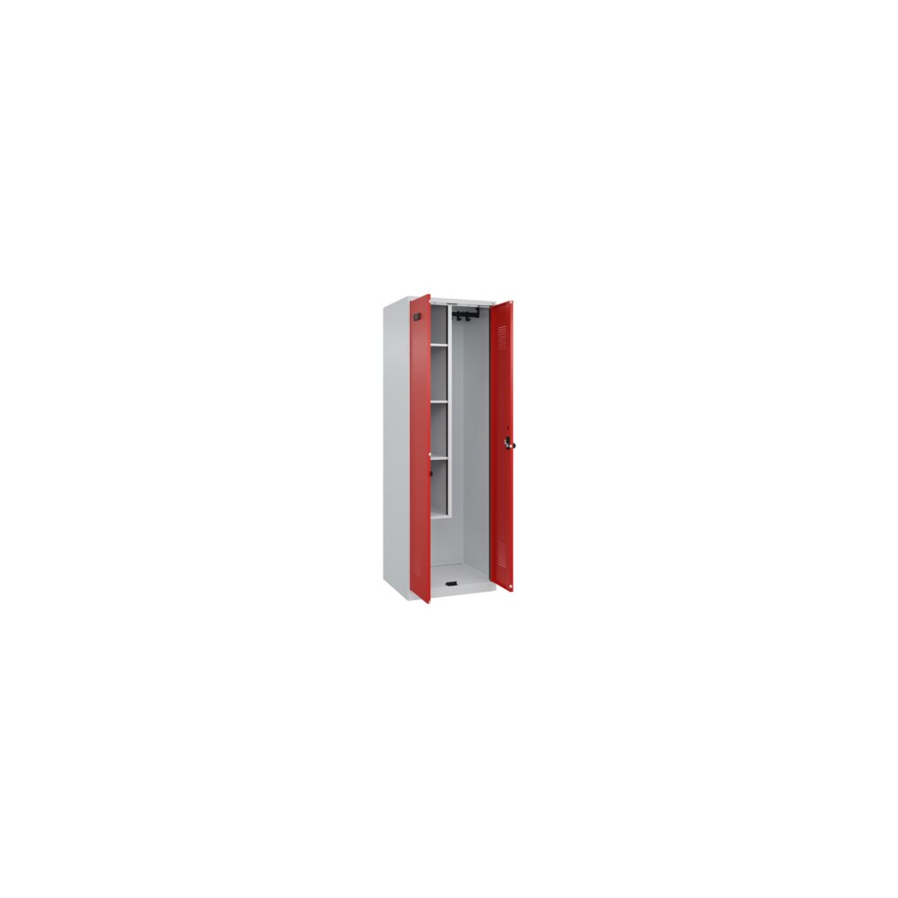 Putzmittel-Spind Evolo PLUS mit hochwertiger Einbrennbeschichtung für hohe UV- und Korrosionsbeständigkeit. Geschlossene und abgeschrägte Seitenprofile für leichte Innenreinigung und komfortable Entnahme von Kleidung und Taschen. Geeignet für verdeckte Kabelführung. Mit hinteren Belüftungsöffnungen oben und unten. Innen verkürzte Mitteltrennwand. Links Fachböden. Rechts 1 Ablageboden, darunter 1 stabile Garderobenstange aus Ovalprofil mit 3 verdrehsicheren Doppel-Schiebehaken inkl. Systemaufnahme. Türen zueinander schlagend für gemeinsamen Verschluss. Mit Bodengleitern als praktischer Schrank- und Fußbodenschutz. Türöffnungsbegrenzer als Schutz vor Überdehnen der Tür. Türen mit Soft-Anschlag und geschlossenen Seitenprofilen für höchste Stabilität. Mit reinigungsfreundlichem Belüftungslochbild oben und unten. Aufhängung in stabilen Drehbolzen. Ergonomischer Sicherheits-Drehriegel für Vorhangschloss mit Bügelstärke 6 bis 8 mm, inkl. Tür-Schutz. Kunststoff-Etikettenrahmen, schwarz, selbstklebend, inkl. Klarsichtkunststoff-Abdeckung und weißem Etikett zur individuellen Beschriftung. Achtung: Anlieferungsmöglichkeit durch Sattelschlepper muss gegeben sein.