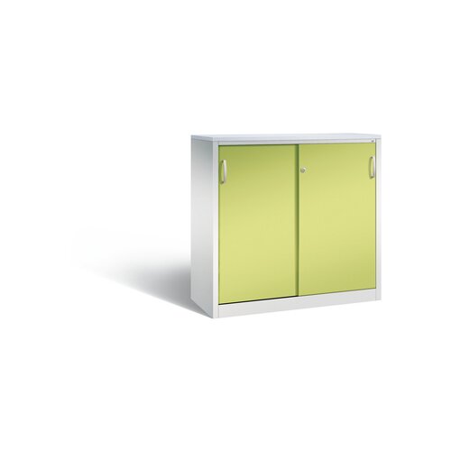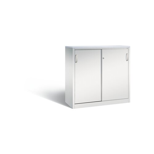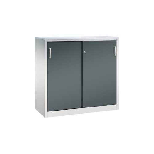 Stahl-Schiebetürenschrank Acurado-2000, als Sideboard. Korpus aus stabiler Stahlkonstruktion mit hochwertiger Einbrennbeschichtung für hohe UV-Beständigkeit, mit Kunststoffgleitern als praktischer Schrank- und Fußbodenschutz. Hohe Flexibilität der Inneneinrichtung durch Höhenverstellbarkeit im 15 mm Raster. Türen verstärkt für hohe Stabilität, leichtgängige Bedienung durch Leichtlaufrollen in spezieller Schienenführung. 1 Abdeckplatte 25 mm, 2 Ergonomische Bügelgriffe Ergolock aus Metall für einfache Bedienung, 1 Wechselzylinder matt vernickelt. Achtung: Anlieferungsmöglichkeit durch Sattelschlepper muss gegeben sein.