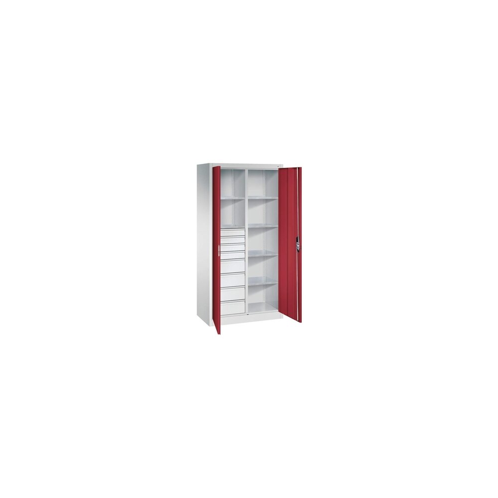 Werkzeugschrank Acurado, Korpus aus stabiler Stahlkonstruktion mit hochwertiger Einbrennbeschichtung für hohe UV-Beständigkeit. Mit Bodengleitern als praktischem Schrank- und Fußbodenschutz. Hohe Flexibilität der Inneneinrichtung durch Höhenverstellbarkeit im Raster. Türen mit geschlossenen Seitenprofilen und verdeckten Schließstangen für höchste Stabilität und Einbruchsicherheit. Mit Softanschlag. Türaufhängung in außen liegenden Scharnieren mit großzügigem Öffnungswinkel. Türen zueinander schlagend für gemeinsamen Verschluss. 3-Riegeliges Ergo-Lock Griffschloss für optimale Bedienungssicherheit und Verschleißfestigkeit, mit patentiertem Mechanismus: Zum Schließen einfach zudrücken. Achtung: Anlieferungsmöglichkeit durch Sattelschlepper muss gegeben sein.