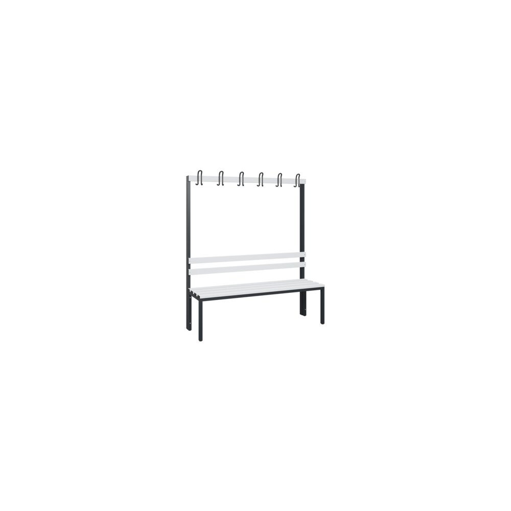 Garderobenbank aus stabilem Vierkant-Stahlrohr 30 x 30 mm. Mit austauschbarem Beschriftungsschild. Latte aus Kunststoff mit Stahlkern für hohe Stabilität. Niveauregulierung zum einfachen Ausgleich von Bodenunebenheiten. Achtung: Anlieferungsmöglichkeit durch Sattelschlepper muss gegeben sein.