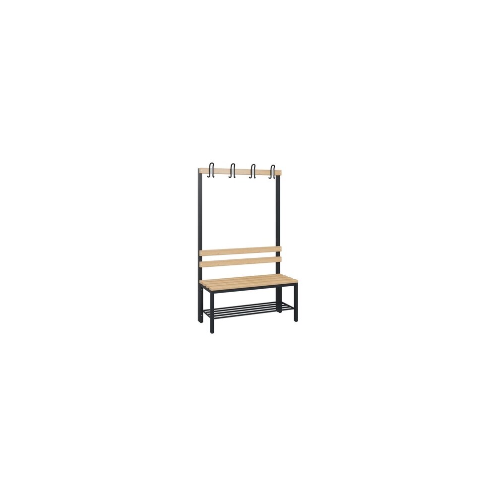 Garderobenbank aus stabilem Vierkant-Stahlrohr 30 x 30 mm. Mit austauschbarem Beschriftungsschild. Niveauregulierung zum einfachen Ausgleich von Bodenunebenheiten. Achtung: Anlieferungsmöglichkeit durch Sattelschlepper muss gegeben sein.