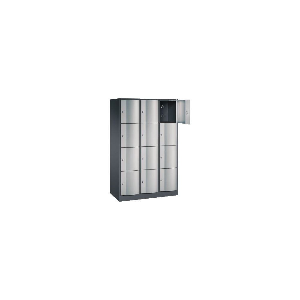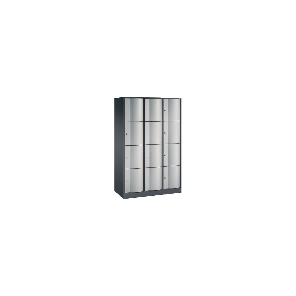 Stahl-Schließfachschrank Resisto. Korpus aus stabiler Stahlkonstruktion mit hochwertiger Einbrennbeschichtung für hohe UV- und Korrosionsbeständigkeit. Spezialtüren aus 1,5 mm Stahl, mit Wölbung nach vorne, absolut stabil und vandalismussicher, mit Anschlagsdämpfer. Türaufhängung durchgängig mit robustem Drehstangen-Scharnier, rechts angeschlagen. Rückwand mit großflächigem Luftdurchlass und 18 mm Wandabstandshaltern. Auf 100 mm hohem Sockel mit 30 mm Niveauregulierung. Schließkreis bis 6000 verschiedene Schließungen. Achtung: Anlieferungsmöglichkeit durch Sattelschlepper muss gegeben sein.