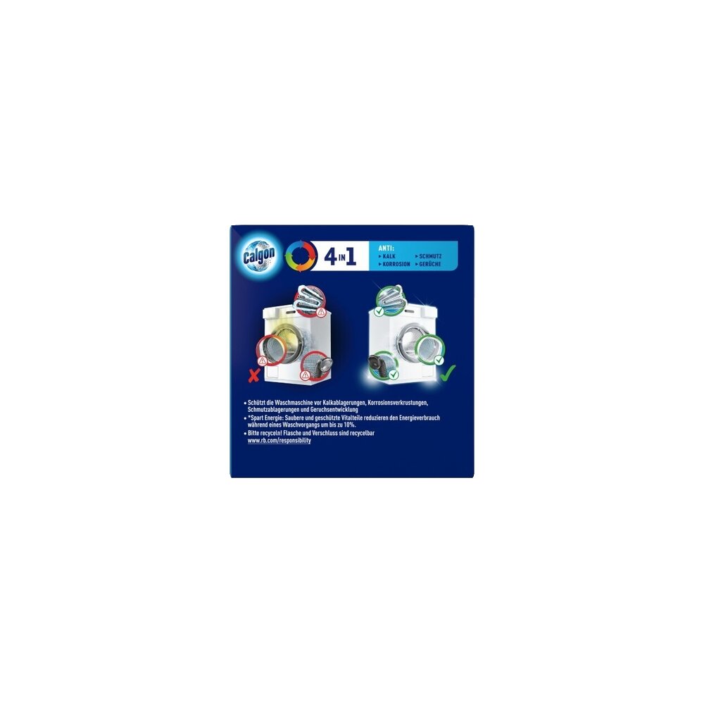 Calgon 4in1 Power Tabs schützen Ihre Waschmaschine von innen - schwer zugängliche Maschinenteile, die mit Wasser in Kontakt kommen, werden so vor Kalk, Korissionen, Schmutzablagerungen und Gerüchen bewahrt.