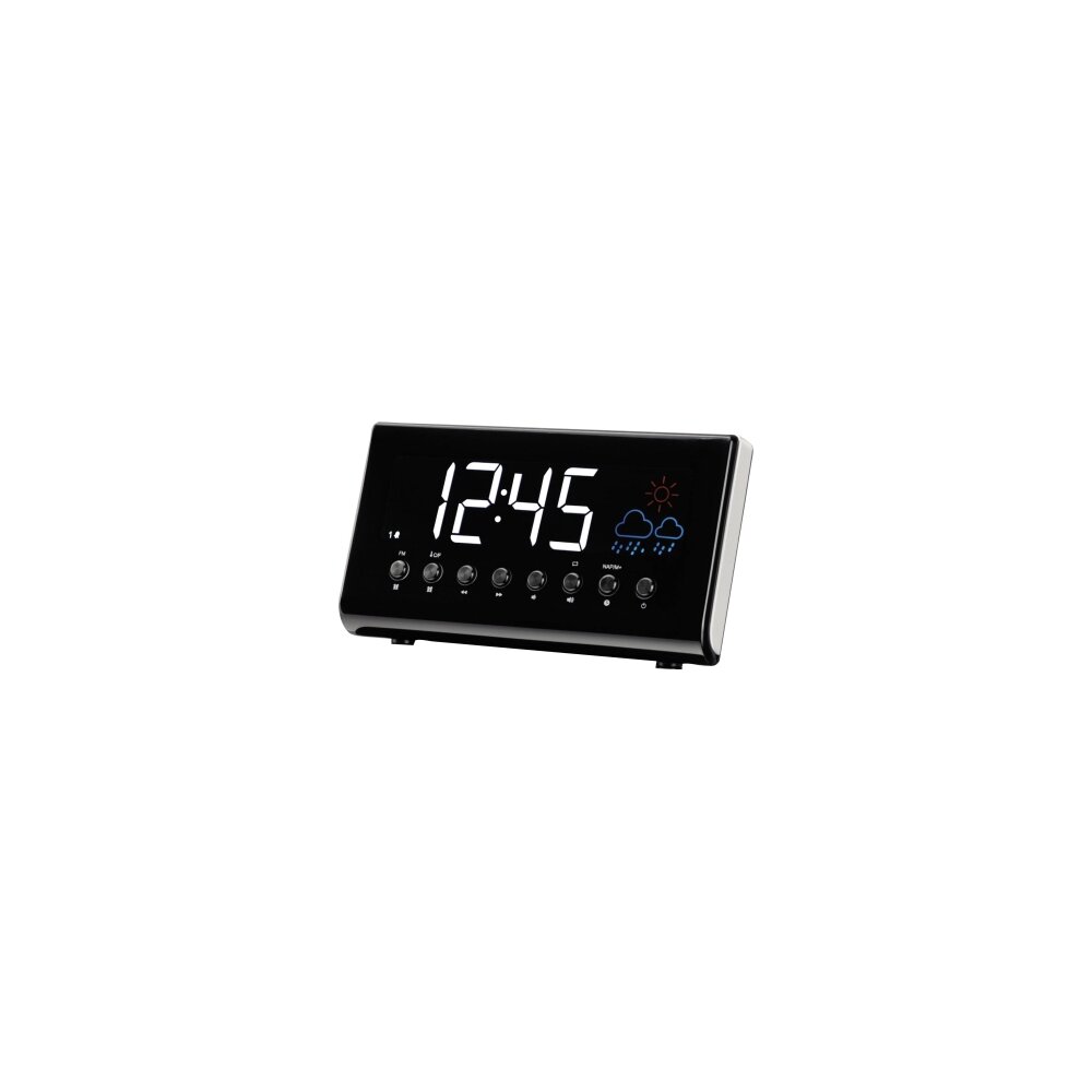 Radiowecker mit Wettervorhersage. Display mit Dimmerfunktion. Innentemperaturanzeige. Dual-Alarm mit Wochenendabschaltung. Alarm durch Radio oder Beeper. Radio mit Senderspeicherplätzen. Snooze/Sleep-Funktion. Knopfzellen zur Gangreserve bei Stromausfall.