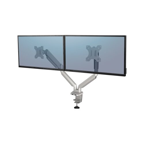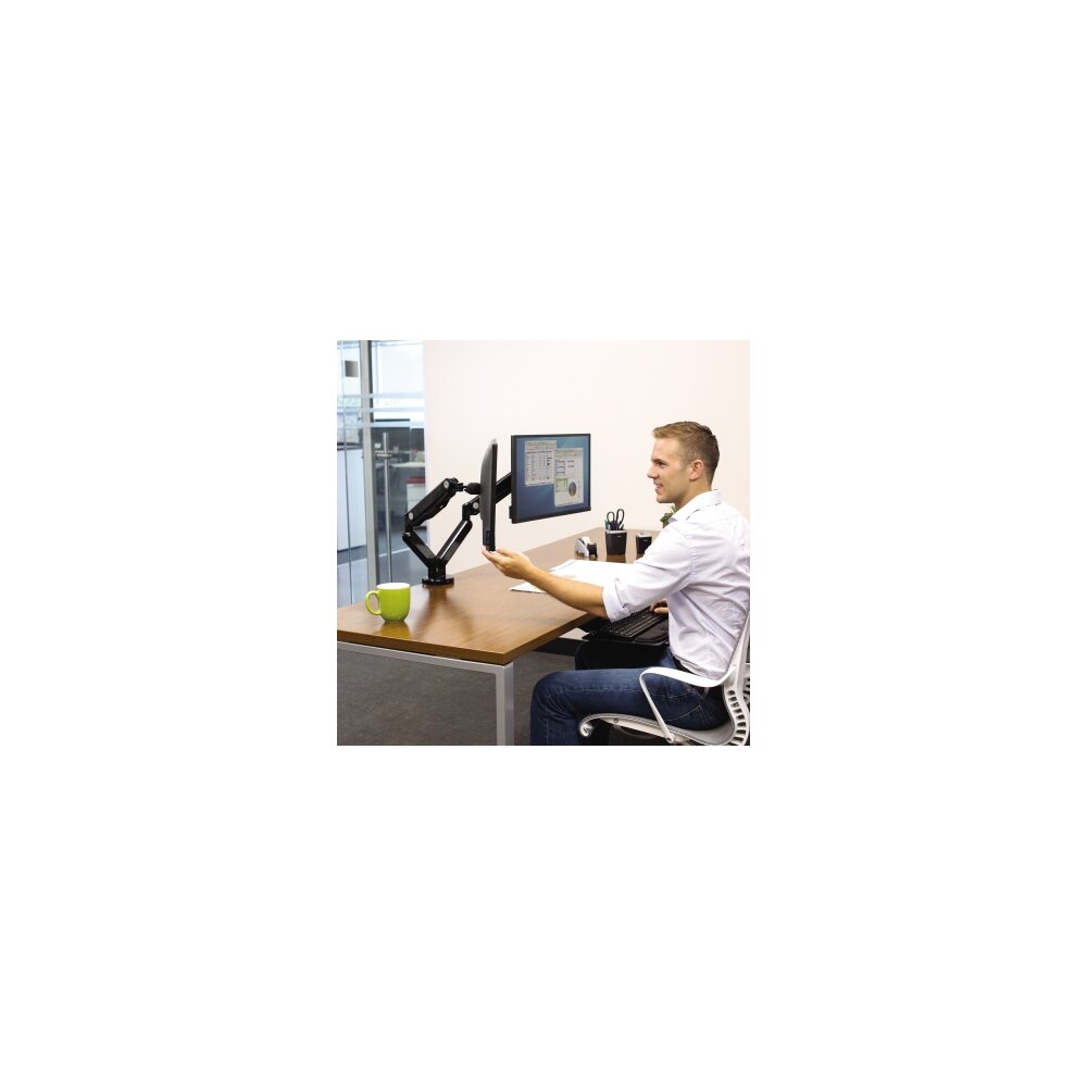 Doppel-Monitorarm. Maximiert den verfügbaren Platz auf dem Schreibtisch und der optimal eingestellte Blickwinkel reduziert Augen-, Nacken- und Schulterschmerzen. Voll verstellbarer Arm mit Gasfeder-Technologie ermöglicht eine gemeinsame Bildschirmnutzung und kollaboratives Arbeiten. Intuitives Kabelmanagement bringt Ordnung an den Arbeitsplatz.