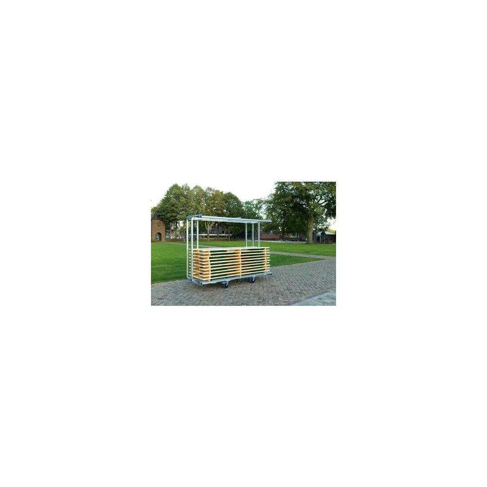 Dieser ausziehbare Transportwagen eignet sich für den Transport und/oder die Lagerung von Bierbänken in verschiedenen Größen. Der Wagen bietet Platz für insgesamt 10 komplette Garnituren, 20 einzelne Tische oder 40 einzelne Bänke.