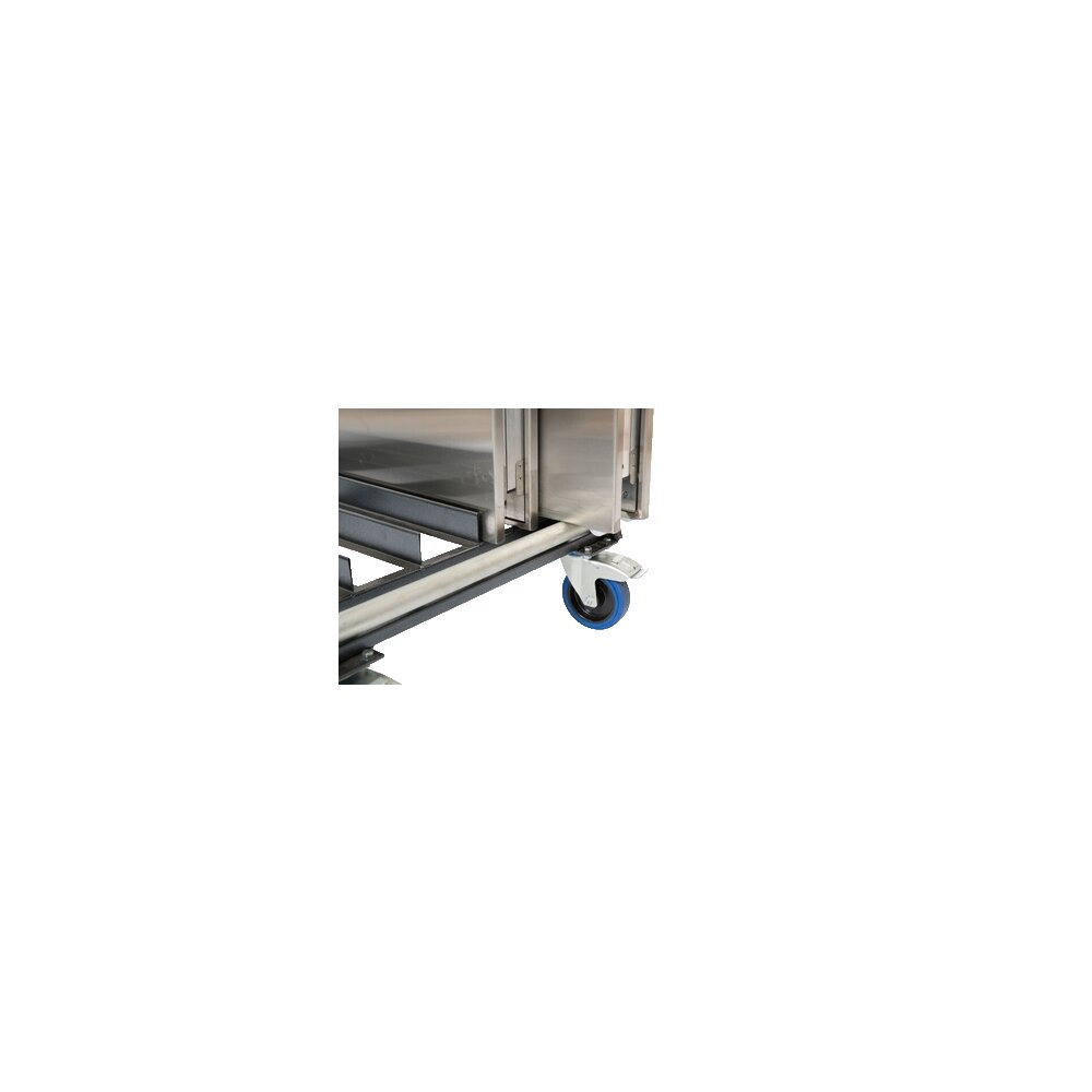 Der Wagen ist mit einer Bremse und einem Rollmechanismus ausgestattet, sodass die Arbeitstische ohne Beschädigung be- und entladen werden können.
