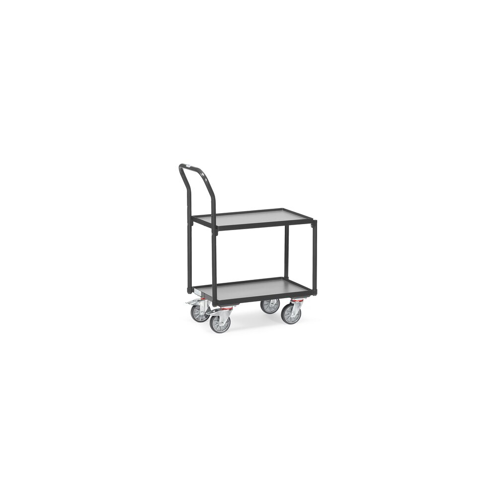 Etagen-Roller mit 2 Plattformen, Rohrschiebebügel und Rand (15 mm). Lichter Etagenabstand 400 mm. Naben mit Rillenkugellager.