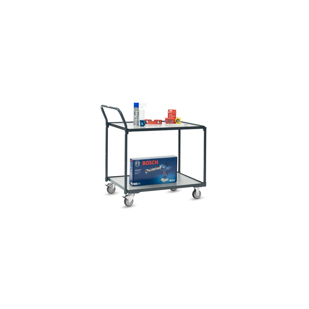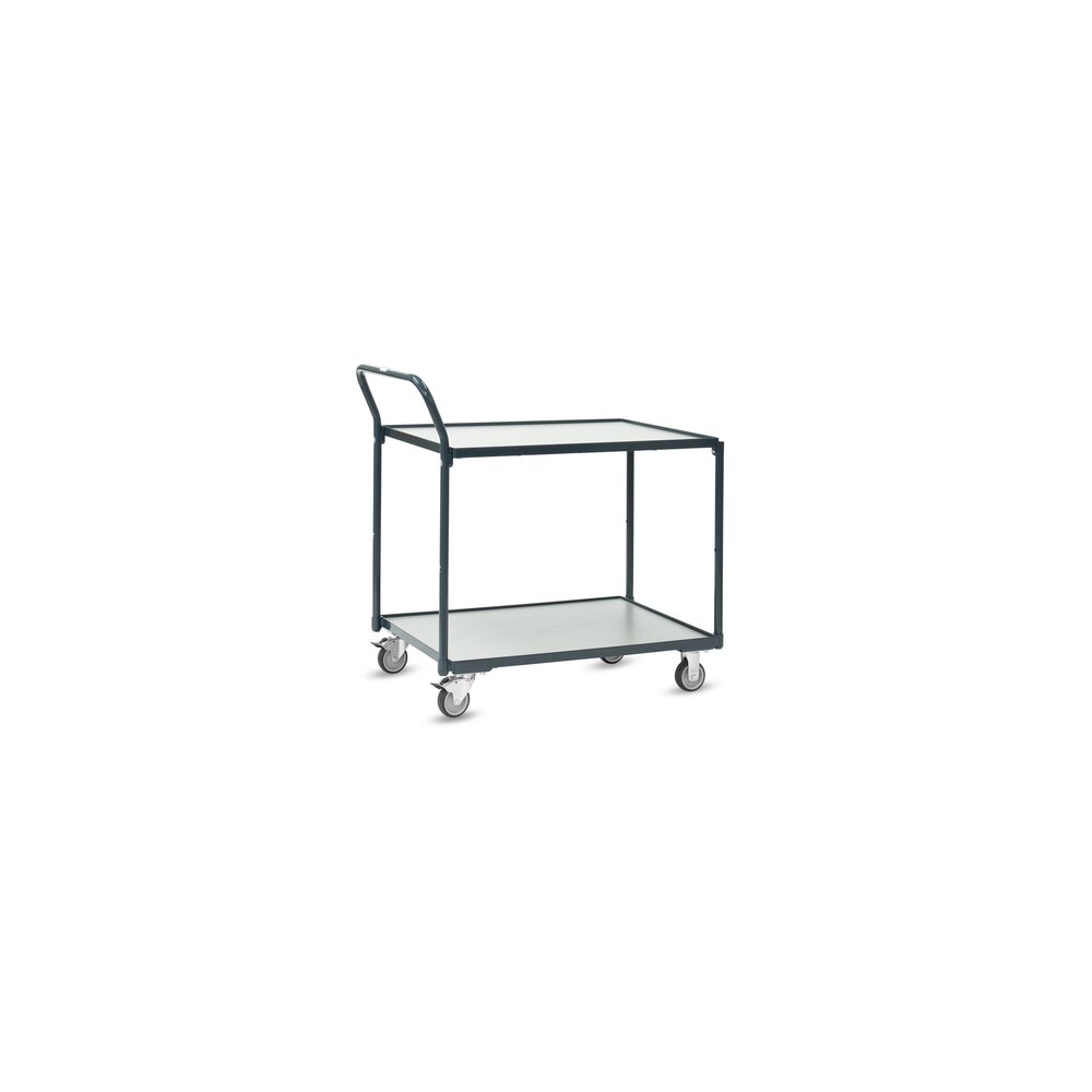 Sehr kompakte und handliche Tischwagen für den flexiblen Einsatz in Büro, Lager und Werkstatt. Reduziert auf das Wesentliche, in bewährter fetra-Qualität. Baukasten-System. Schraubkonstruktion. Böden im Stahlrahmen liegend, Rand 12 mm hoch. Schiebegriff hochstehend. Naben mit Gleitlagerung. Leichte Selbstmontage.