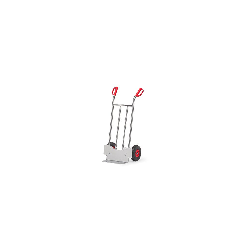 Sackkarre aus Aluminiumrohr mit Aluminiumschaufel, sehr leicht und handlich. Sauber verschweißt und "naturbelassen", Alublechschaufel anschraubbar und dadurch austauschbar. Mit pannensicherer Bereifung auf Kunststoff-Felgen. Naben mit Rollenlagerung. Bügel oben und Querstreben durchgebogen. Für den sicheren Transport von runden Gütern, wie Rollen, Kannen, Eimern usw.