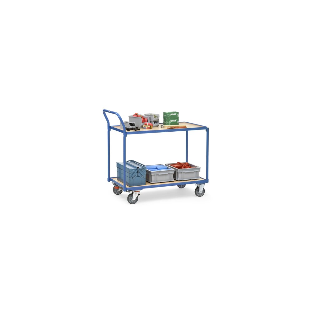 Leichter Tischwagen im Baukasten-System. Stahlrohr und Profilstahl geschweißt, pulverbeschichtet. Schraubkonstruktion. 2 Böden aus Holzwerkstoffplatte, Oberfläche Buchendekor, im Stahlrahmen liegend, Rand 12 mm hoch. Schiebegriff hochstehend. 2 Lenk- und 2 Bockrollen. Naben mit Rillenkugellager. Feststeller an den Lenkrollen. Tragkraft obere Ladefläche 80 kg.