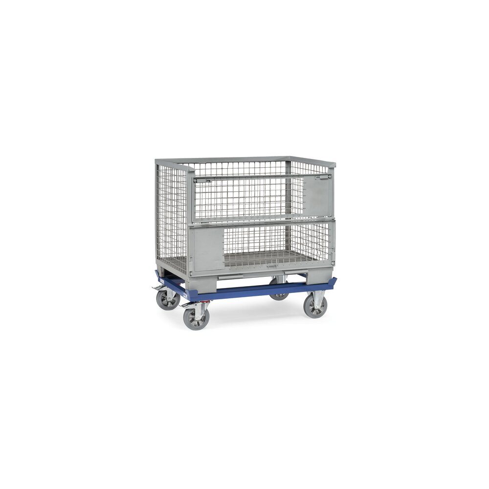 Robuste Schweißkonstruktion, mit 4 Fangecken. Mit 2 Lenk- und 2 Bockrollen. Naben mit Kugellager, blaugrau "spurlos", Feststeller an den Lenkrollen, gemäß der europäischen Norm EN 1757-3 (Sicherheit von Plattformwagen). Geringer Rollwiderstand, elastischer Lauf, keine Fahrgeräusche.