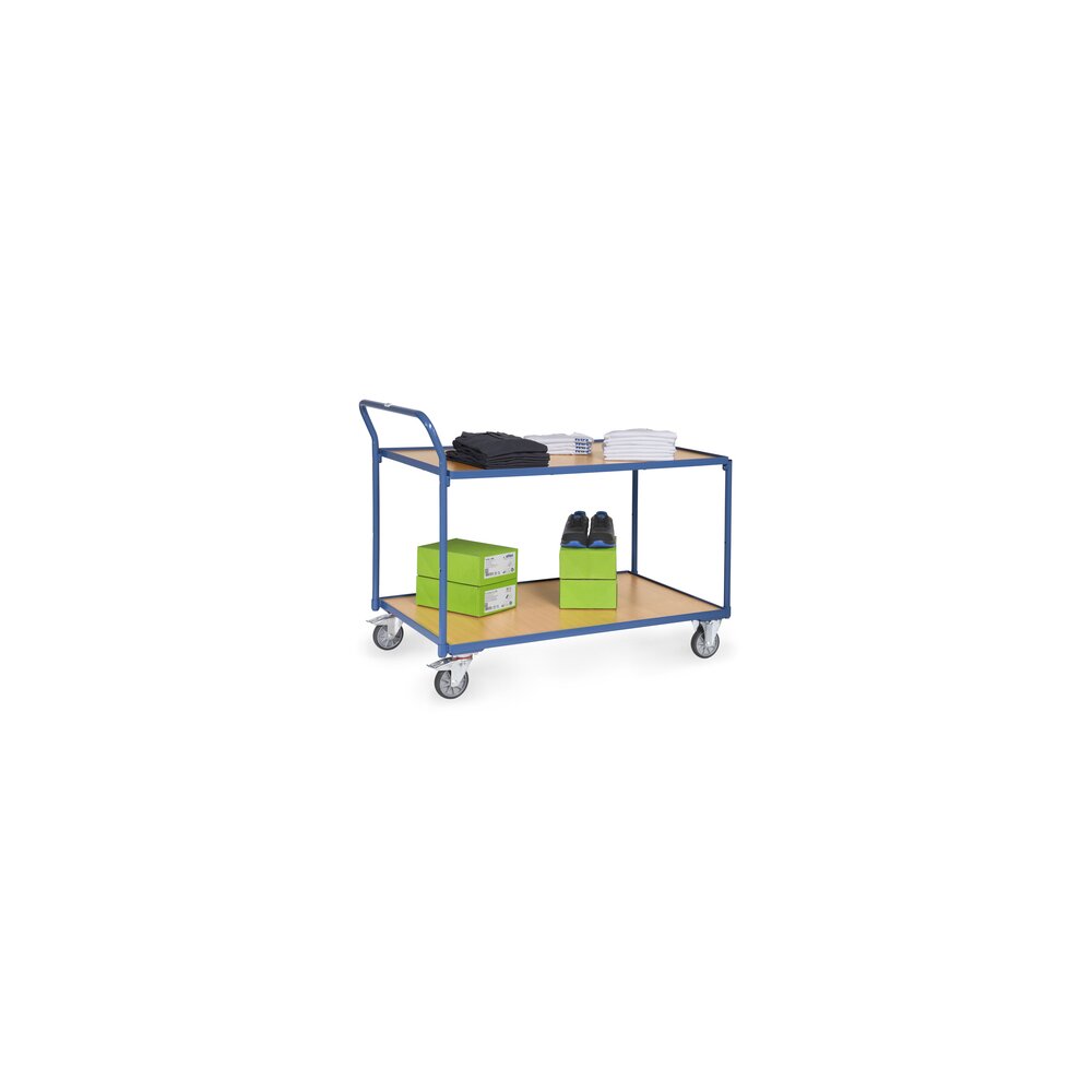 Leichter Tischwagen im Baukasten-System. Stahlrohr und Profilstahl geschweißt, pulverbeschichtet. Schraubkonstruktion. 2 Böden aus Holzwerkstoffplatte, Oberfläche Buchendekor, im Stahlrahmen liegend, Rand 12 mm hoch. Schiebegriff hochstehend. 2 Lenk- und 2 Bockrollen. Naben mit Rillenkugellager. Feststeller an den Lenkrollen. Tragkraft obere Ladefläche 80 kg.