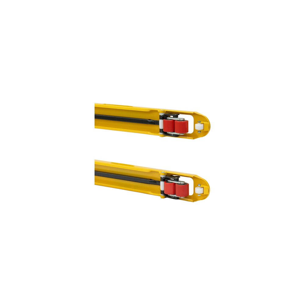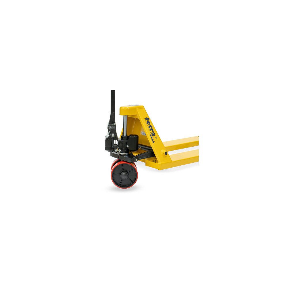 Rahmen und Gabeln in verwindungsfreier Schalenbauweise, gelb pulverbeschichtet. Hydraulische Handpumpe wartungsfrei gelagert. Stabile Stahlrohrdeichsel mit Gegenlager für Schubbetrieb, pulverbeschichtet schwarz, Griff gummiummantelt. Bedienhebel für die Funktionen: Heben - Fahren - Senken. Lenkeinschlag 2 x 100°. Kletterrollen an den Gabelspitzen. Beräderung: Geringer Rollwiderstand, elastischer Lauf. Gut auf empfindlichen Böden, nicht kreidend = spurlos. Geringe Fahrgeräusche. Lenkräder: 20 x 5 cm (Ø x B). Gabelrolle: 8 x 7 cm (Ø x B).
