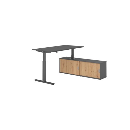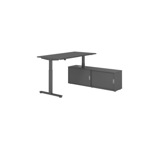 Schreibtisch XMST16 mit Tastschalter. Hubsäule taucht links oder rechts ein. Tisch kann mit beiliegender Kufe als separates Einzelmöbel verwendet werden. Sideboard mit 2 Schiebetüren. Einfache Montage.