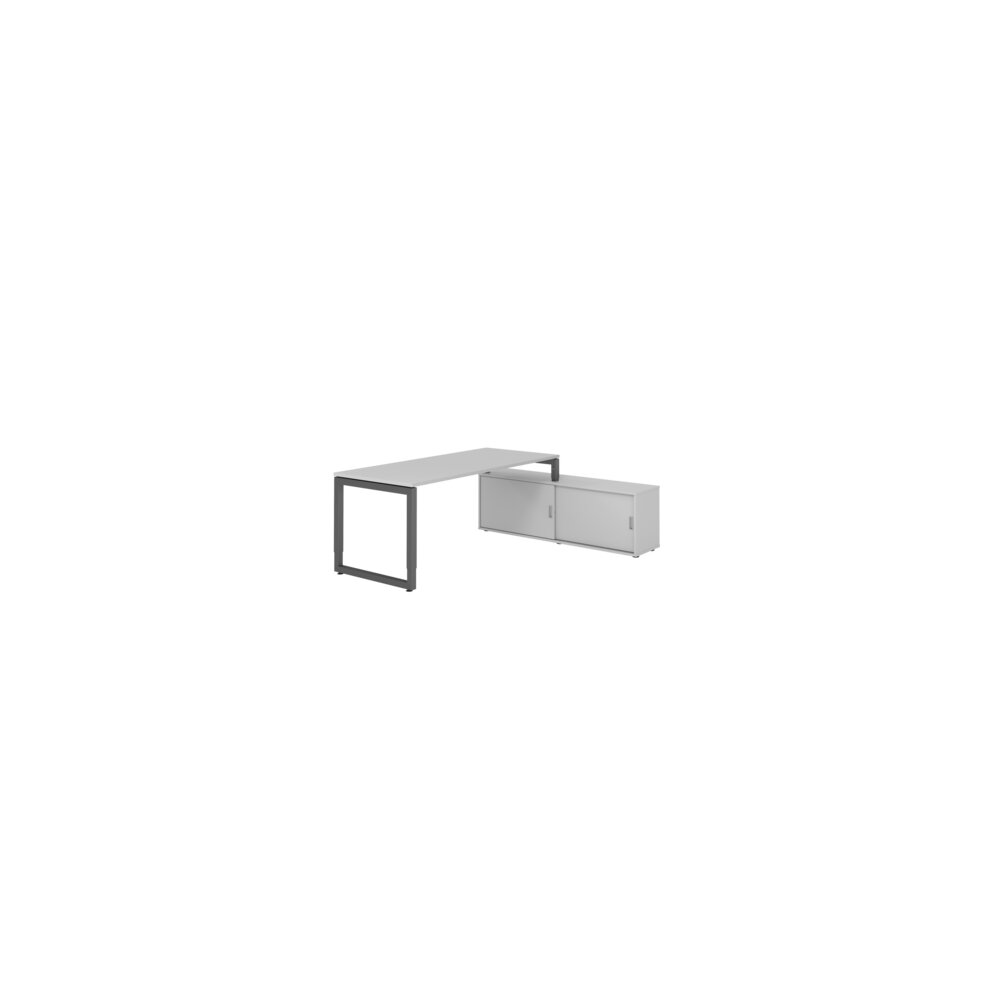 Aufsatz-Schreibtisch RSE19 mit schwebender Tischplatte, In 1 cm Schritten höhenverstellbar. Sideboard mit 2 Schiebetüren. Tisch kann mit beiliegender Kufe als separates Einzelmöbel verwendet werden. Einfache Montage.
