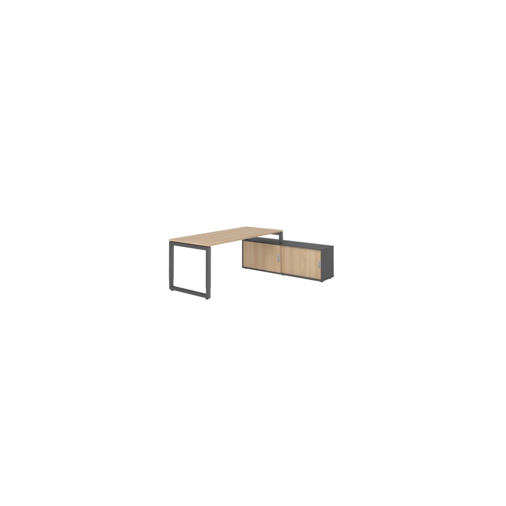 Aufsatz-Schreibtisch RSE19 mit schwebender Tischplatte, In 1 cm Schritten höhenverstellbar. Sideboard mit 2 Schiebetüren. Tisch kann mit beiliegender Kufe als separates Einzelmöbel verwendet werden. Einfache Montage.