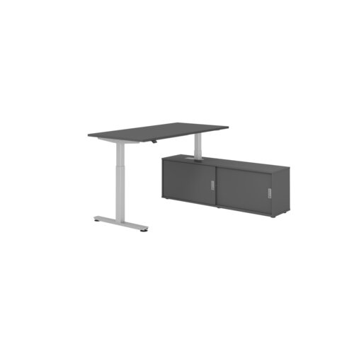 Schreibtisch XMST16 mit Tastschalter. Hubsäule taucht links oder rechts ein. Tisch kann mit beiliegender Kufe als separates Einzelmöbel verwendet werden. Sideboard mit 2 Schiebetüren. Einfache Montage.