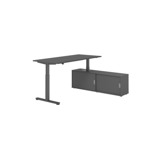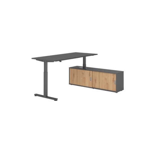Schreibtisch XMST16 mit Tastschalter. Hubsäule taucht links oder rechts ein. Tisch kann mit beiliegender Kufe als separates Einzelmöbel verwendet werden. Sideboard mit 2 Schiebetüren. Einfache Montage.