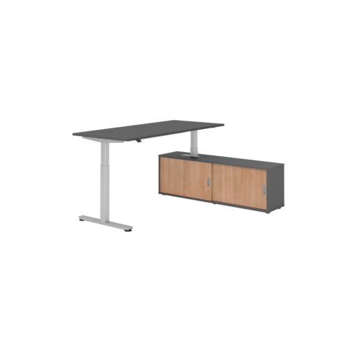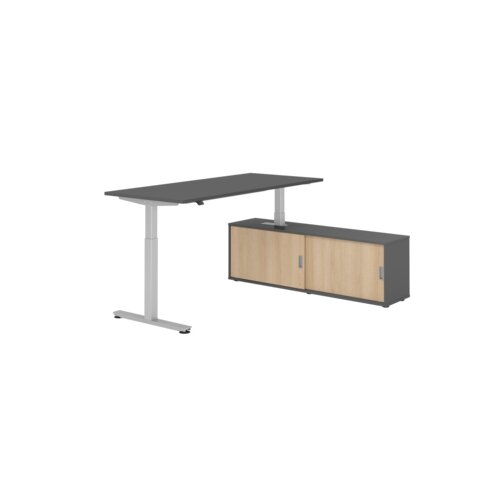 Schreibtisch XMST16 mit Tastschalter. Hubsäule taucht links oder rechts ein. Tisch kann mit beiliegender Kufe als separates Einzelmöbel verwendet werden. Sideboard mit 2 Schiebetüren. Einfache Montage.