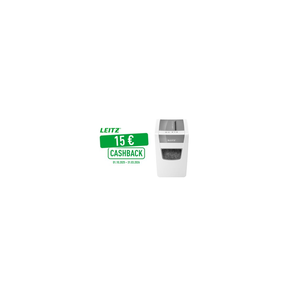 Ein eleganter, superleiser und schmaler Aktenvernichter für kleine Büros mit 1-2 Benutzern. Mit seiner äußerst kompakten Größe eignet er sich ideal für den Einsatz zu Hause und im Büro. Bringen Sie etwas Stil an Ihren Arbeitsplatz mit diesem staufreien, superleisen Aktenvernichter mit langer Laufzeit. Mit Touch-Control und Anti-Papierstau-Technologie sowie LED-Anzeige für Überhitzungsschutz. 1 zusätzliches Jahr Garantie bei Registrierung auf www.Leitz.com. Leitz startet im Aktionszeitraum vom 01. Oktober bis 31. März 2026 eine Cashback-Kampagne auf ausgewählte Aktenvernichter und Laminiergeräte. Gehen Sie auf https://www.leitz.com/de-de/promotions/cashback, um Ihren Beleg einzureichen und zu sparen!
