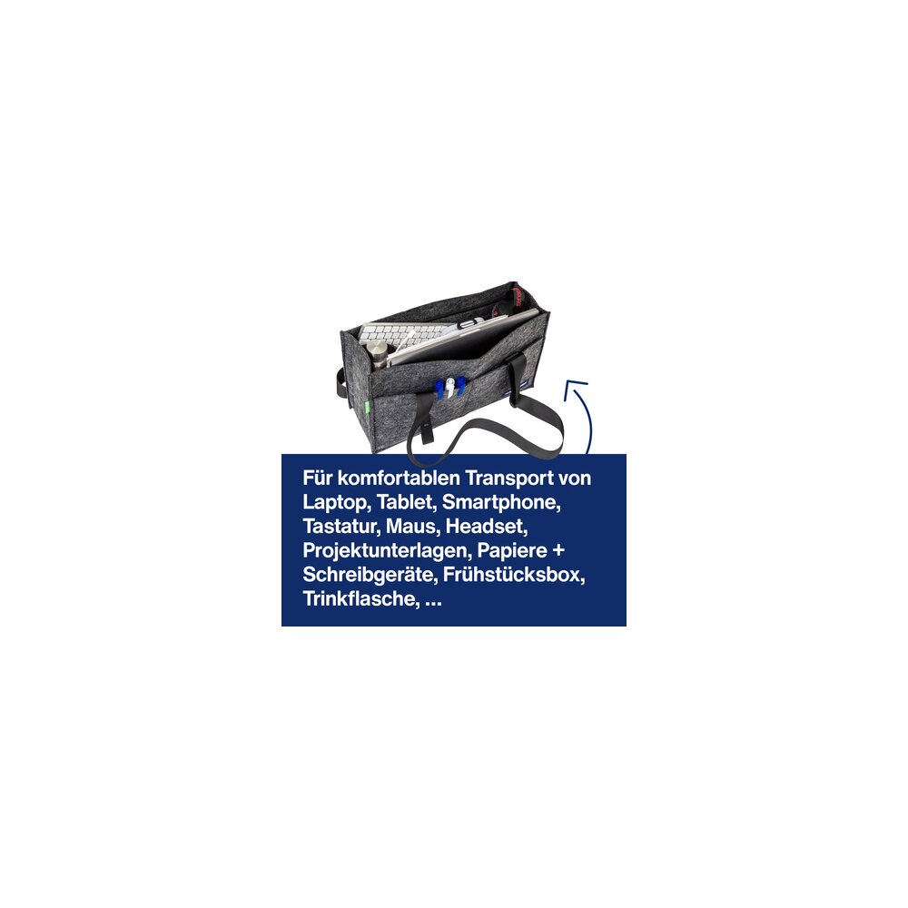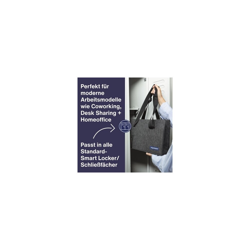 Die umweltfreundliche und praktische magnetoplan Bürotasche ist Ihr verlässlicher Partner für flexibles Arbeiten. Perfekt abgestimmt auf moderne Arbeitsmodelle wie Coworking, Desk-Sharing und Homeoffice. Sie ermöglicht es Ihnen, Ihre Arbeitsmaterialien mühelos zu transportieren, sodass Sie überall und jederzeit bestens ausgestattet sind. Passend für gängige Locker- oder Schließfächer.