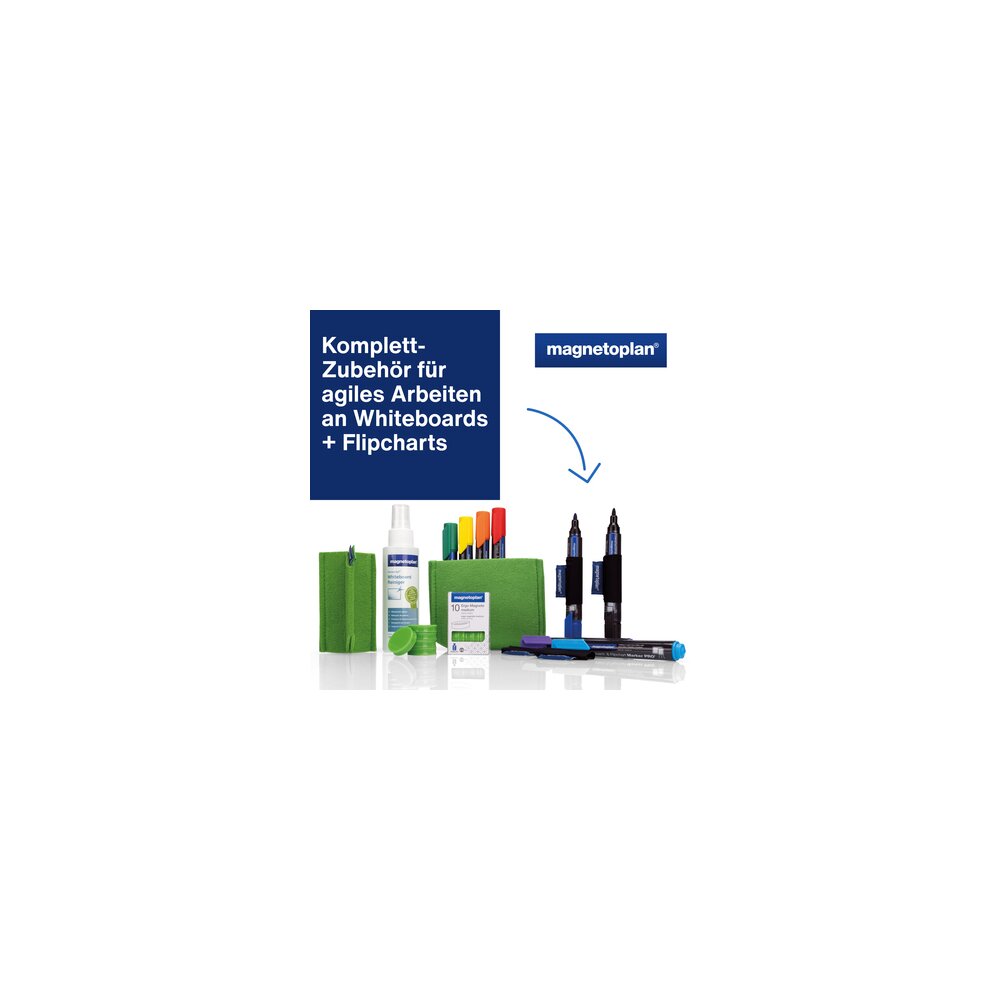 Das Whiteboard Essentials Kit enthält das Komplett-Zubehör, für agiles Arbeiten an Whiteboard und Flipchart.