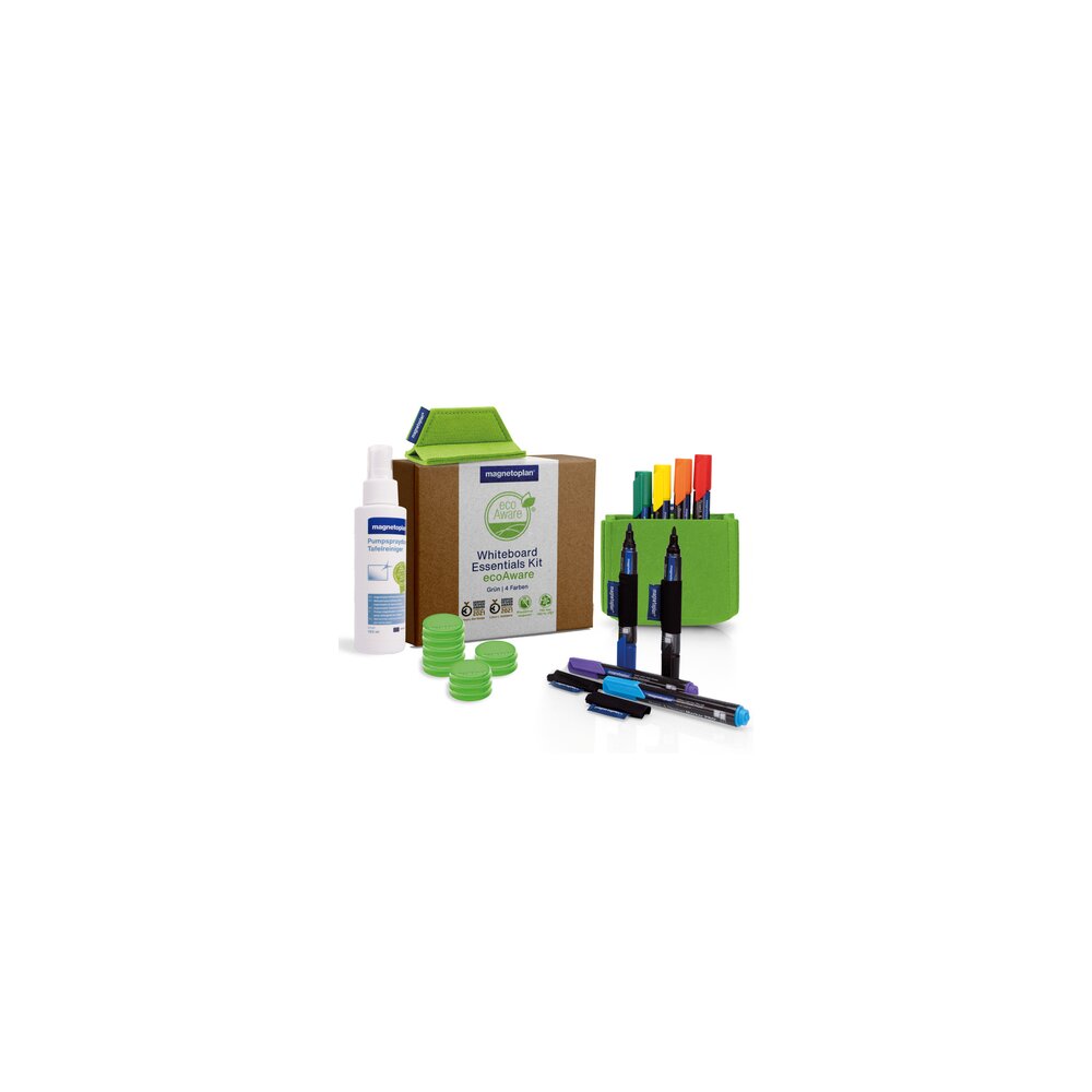 | Ausführung des Inhalts (bzgl. der Hauptausstattungsteile) | 1 magnetoWipe ecoAware grün (magnetischer Tafellöscher aus rPET-Filz 30º Handwäsche), 1 magnetoTray ecoAware Medium grün (magnetischer Stifteköcher aus rPET-Filz), 4 magnetoSleeves (magnetisch für PRO+ Serie), 8 Boardmarker PRO+ (grün, rot, blau, schwarz, gelb, hellblau, violett, orange), 1 Pumpspraydose Tafelreiniger (125 ml), 10 Ergo-Magnete Medium grün (Ø 34 mm) |