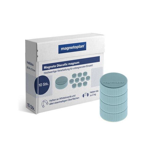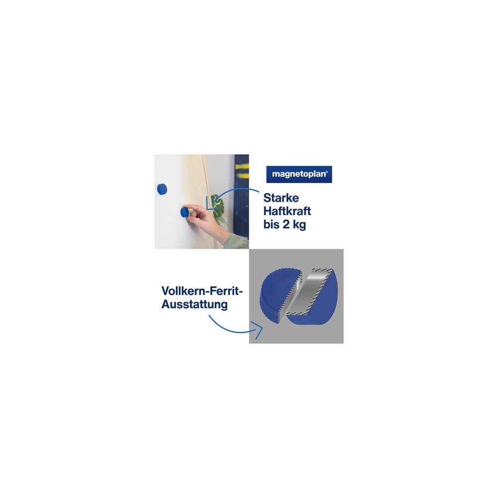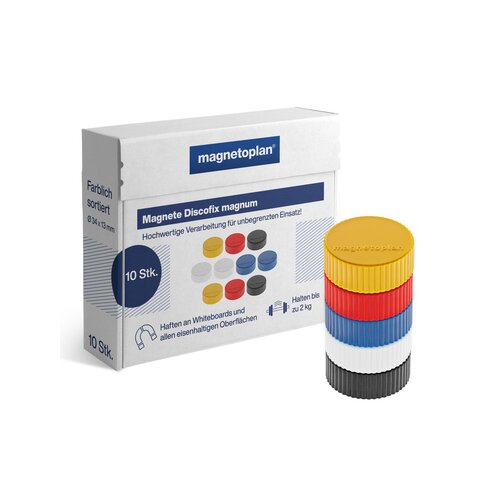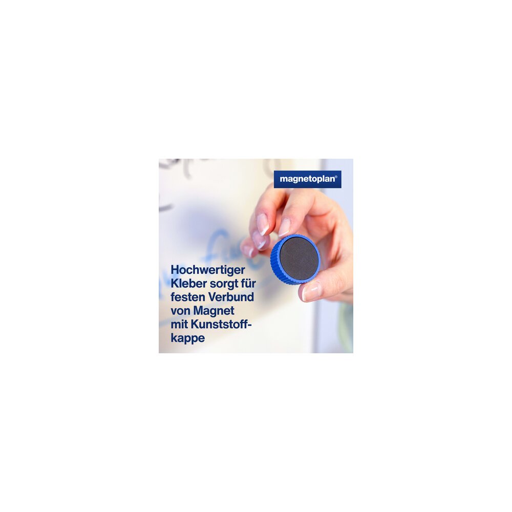 Discofix Magnum, mit Vollkern-Ferrit Ausstattung. Die Magnete verfügen über eine spezialbeschichtete Magnet-Unterseite, um ein Verkratzen der Tafeln zu verhindern. Durch die Verwendung eines hochwertigen Klebers, bleiben die Kunststoffkappen mit dem Magneten fest verbunden. Sind qualitativ erstklassig verarbeitet und dadurch praktisch unbegrenzt einsatzfähig.