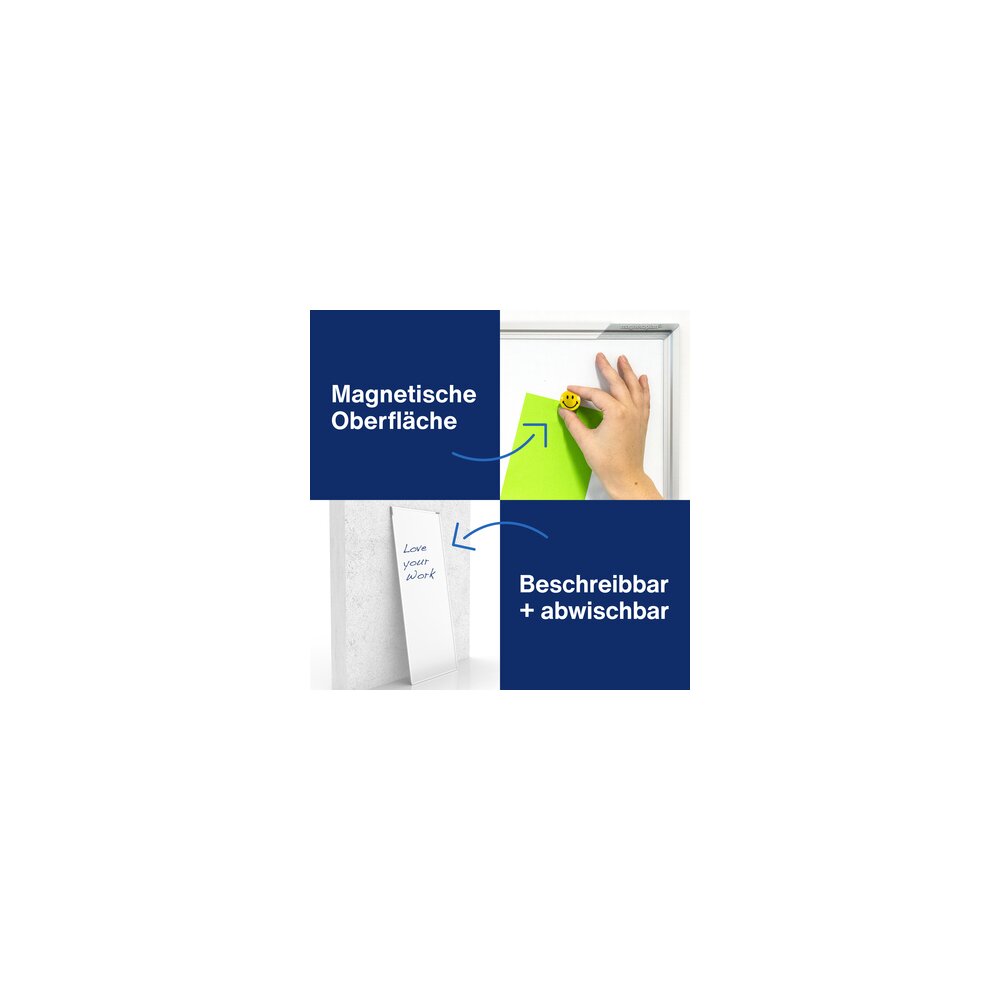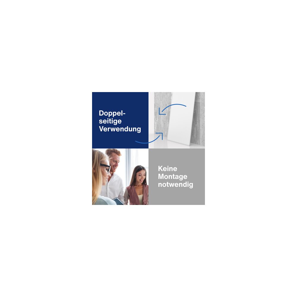 Mit dem Design-Thinking Whiteboard sind spontane, agile Meetings, auch ohne festen Besprechungsraum, jederzeit und überall möglich! Das Design-Thinking Whiteboard bietet Ihnen die ideale Lösung für agiles + kreatives Arbeiten. Mit dem Design-Thinking-Whiteboard können Sie Workflows, To-dos oder Projekte, auch ohne zur Verfügung stehende Wände, für alle sichtbar kommunizieren + visualisieren. Hochkant, also besonders schlank und platzsparend, lässt es sich überallhin bequem mitnehmen. Das Design-Thinking Whiteboard einfach an die Wand lehnen + loslegen. Für XXL-Präsentationsflächen lassen sich mehrere Boards auch flexibel nebeneinander aufstellen. Das Antirutsch-Inlay gewährleistet dabei sicheren Stand auf jedem Untergrund, egal ob Fliesen, Laminat oder Teppich. Mithilfe des Wall Trays (Art.-Nr. 1241295) lässt sich das Design-Thinking Whiteboard sogar an der Wand befestigen (im Querformat möglich). Design-Thinking Whiteboard, mit Boardmarkern beschreib- und wieder abwischbar. Schreibfläche in Premium-Qualität mit 5 Jahren Oberflächen-Garantie: Nachhaltig - langlebig - zu 98 % recycelbar. Hergestellt mit Holz aus nachhaltiger Forstwirtschaft.