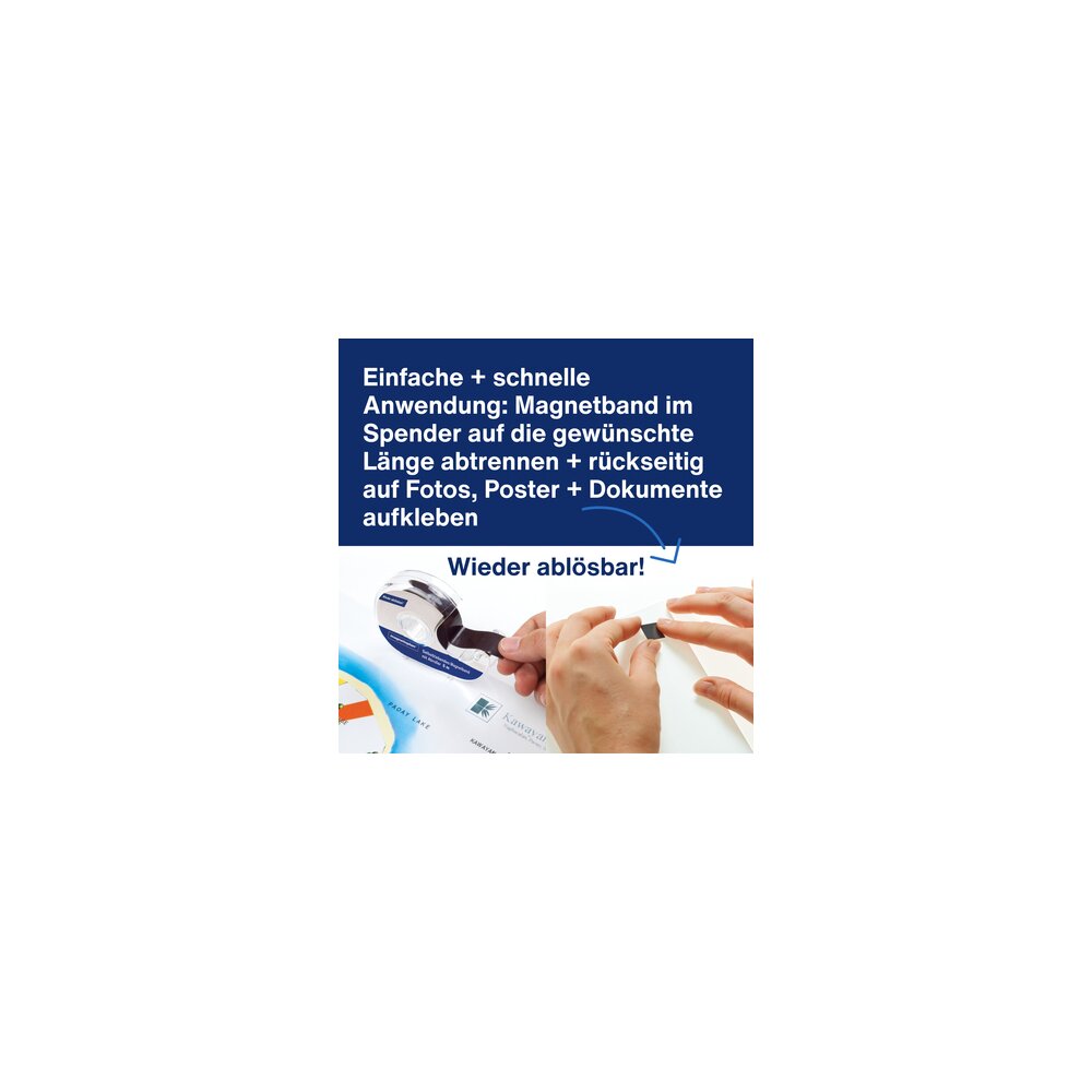 Praktischer Handabroller mit 5 m Magnetband. Zur sauberen und unsichtbaren Befestigung von Postern, Fotos, Notizen etc., an allen metallhaltigen Oberflächen. Für Messebau, Schule, Büro oder im Privatbereich, flexibel einsetzbar. Mit dem Abroller trennen Sie die gewünschte Länge des Magnetbands einfach ab und kleben es rückseitig auf Papier oder Karton, schon halten z.B. Memos, Poster oder Fotos unsichtbar auf allen metallhaltigen Oberflächen. Kein Magnet im Sichtfeld - die Information im Vordergrund. Das Band ist rückstandslos wieder ablösbar.