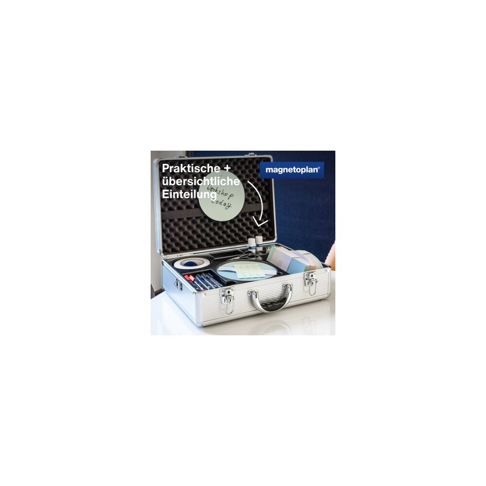 Inhalt: 500 Kommunikationskarten, rechteckig 200 x 100 mm farbig sortiert, 200 Kommunikationskarten, Ø 100 mm farbig sortiert, 150 Kommunikationskarten, Ø 140 mm farbig sortiert, 150 Kommunikationskarten, Ø 190 mm farbig sortiert, 200 Kommunikationskarten, 190 mm x 110 mm, oval farbig sortiert, 10 Board- und Flipchart-Marker (6 x schwarz, 4 x rot), 4 Boardmarker Jumbo (1 x rot, 1 x grün, 1x blau, 1 x schwarz), 400 Pinnnadeln, 1 Teleskop-Zeigestab, 2 Klebestifte, je 20 g, 1 Papierschere 6 Zoll, 1 Cutter Klingenbreite 9 mm, 1 Klebefilmabroller mit 1 Klebefilmrolle 25 m x 19 mm, 1 Klebeband Krepprolle 50 m x 30 mm, 1200 Markierungspunkte (300 x gelb, 300 x blau, 300 x grün, 300 x rot), 1 Nadelkissen.