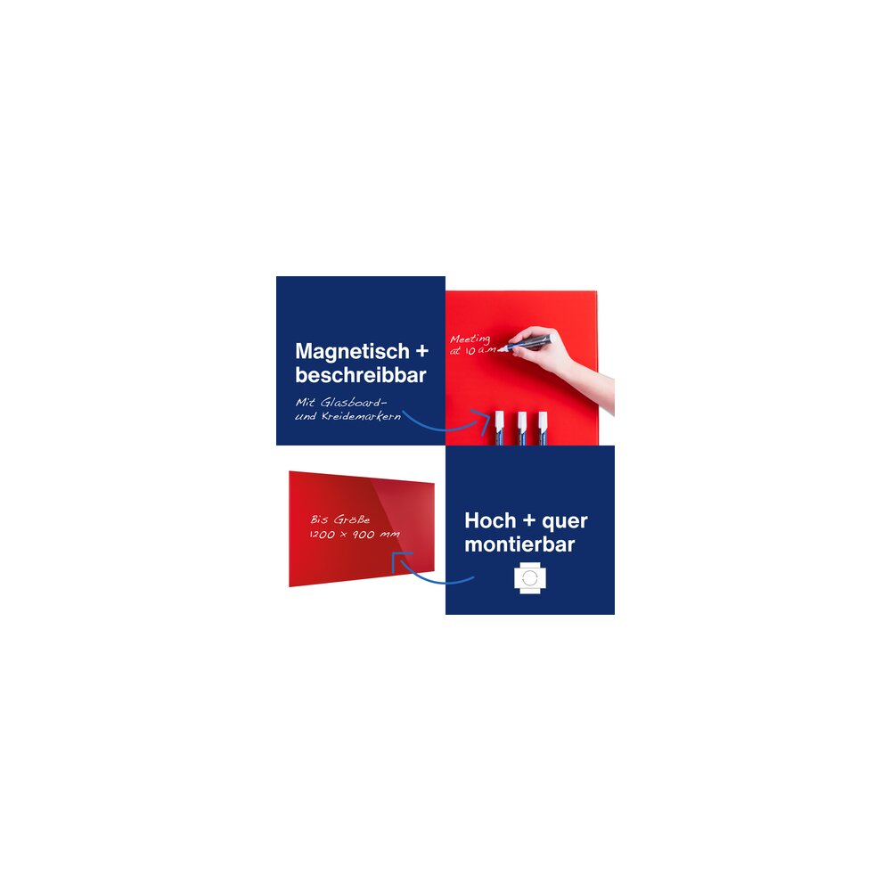 Glasboards sind die moderne, elegante Alternative zu herkömmlichen Whiteboards. Sie überzeugen durch das elegante + luxuriöse Erscheinungsbild mit purer Ästhetik. Die Boards lassen sich in jeder gewünschten Kombination montieren: Nebeneinander, untereinander oder im rechten Winkel zueinander. Durch ihre Farbe, Form und das ansprechende Erscheinungsbild fügen sich die Glasboards perfekt in jede Inneneinrichtung ein. Es haften nur Neodym-Magnete.