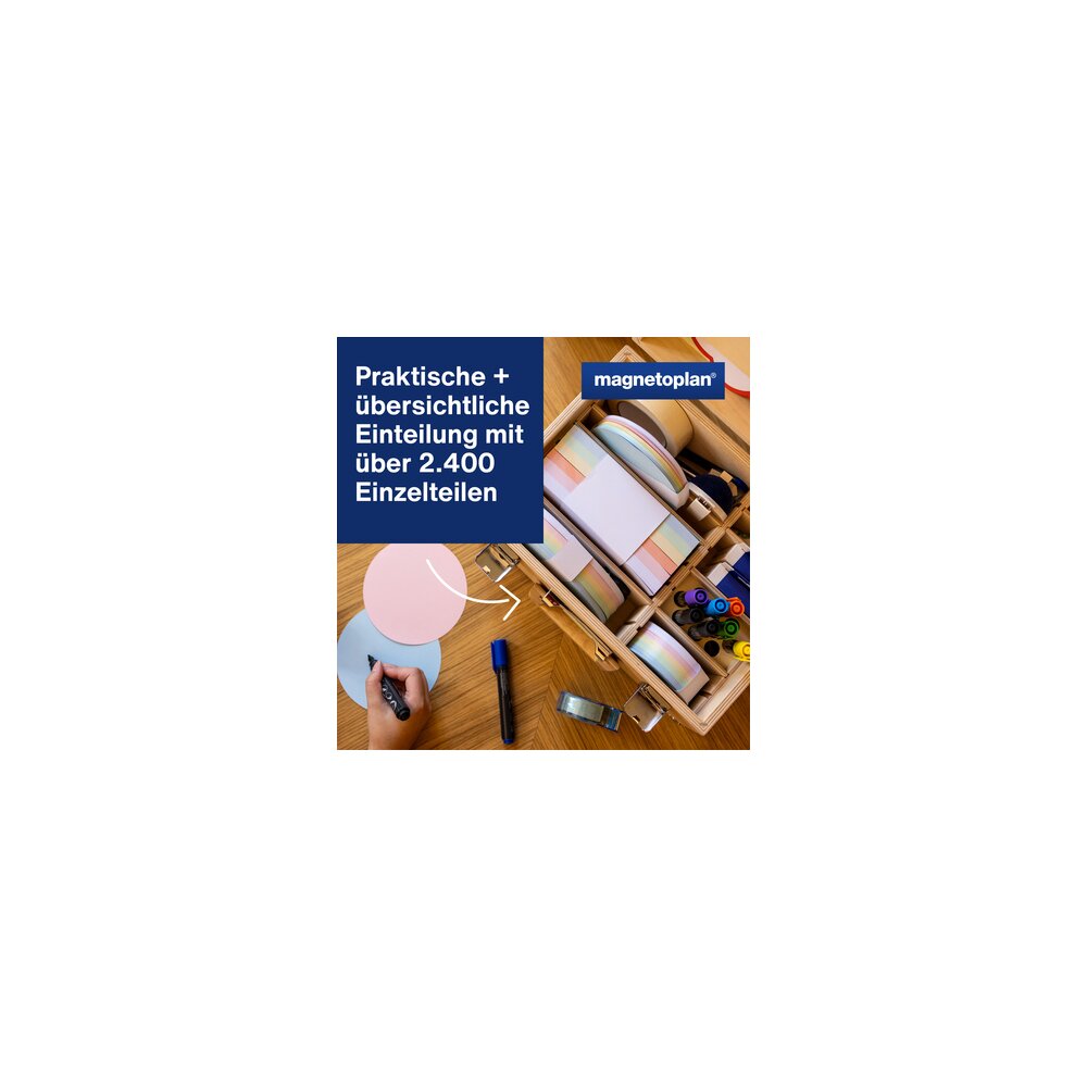 Dank der herausnehmbaren Stechfächer kann der Koffer individuell bestückt werden, sodass Sie ihn an Ihre persönlichen Bedürfnisse und Arbeitsweise anpassen können. Kugelfüße mit Filzgleitern sorgen dafür, dass Ihre Tischoberflächen geschützt bleiben. Inhalt: 500 x Moderationskarten rechteckig 200 x 100 mm in 6 Farben sortiert, 250 x Moderationskarten rund Ø 100 mm in 5 Farben sortiert, 125 x Moderationskarten rund Ø 140 mm in 5 Farben sortiert, 250 x Moderationskarten oval, 190 x 110 mm in 5 Farben sortiert, 20 x Moderationswolken, 230 x 145 mm in weiß/rot, 1.200 x Markierungspunkte gelb, blau, grün + rot je 300 Stück, 10 Board- und Flipchart-Marker PRO+, 3 x schwarz, je 1 x rot, blau, grün, violett, orange, hellblau + gelb, 1 x Klebefilm-Handabroller mit Klebeband, 25 m x 19 mm, 1 x Krepp-Klebeband 50 m x 30 mm, 2 x Klebestifte á 20 g, 50 x Design Pins Wood Series, 1 x Nadelkissen, 1 x Papierschere 6 Zoll, 1 x Cutter, 1 x Teleskop-Zeigestab.