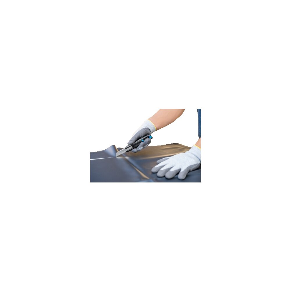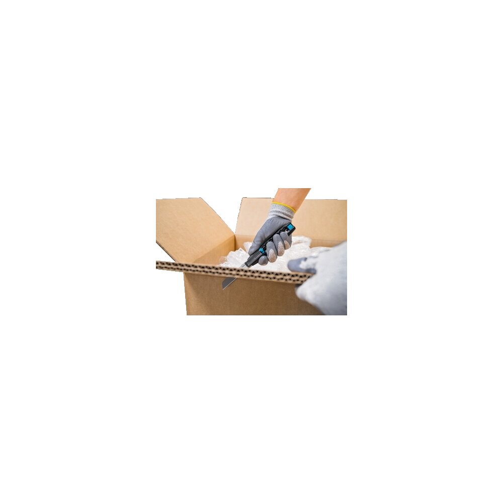 Ein Sicherheitsmesser, das auch als Cuttermesser performt? Das neue SECUBASE 383 kann beides. Ihr Schneidwerkzeug ist zunächst einmal mit einem automatischen Klingenrückzug ausgestattet, um Schnittverletzungen zu vermeiden. Bestimmte Schneidanwendungen gehen aber mit fixierter Klinge besser von der Hand, darunter auch der Sägeschnitt. Dafür können Sie optional die Klinge in sieben verschiedenen Stufen arretieren. So lässt sich effizient arbeiten. „Lang“ ist eigentlich untertrieben: So können Sie mit dem SECUBASE 383 mühelos z.B. 4-lagige Kartons, Sackwaren, Papierbahnen und -rollen, Bauschaum und Styroporplatten sicher schneiden. Um an die lange, biegsame Klinge zu gelangen, nutzen Sie den blauen Klingenwechselknopf am Ende des Griffs. Jetzt können Sie das Innenteil inkl. Schieber herausziehen. Die Klinge wird von zwei Magneten in Position gehalten.